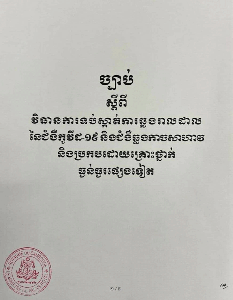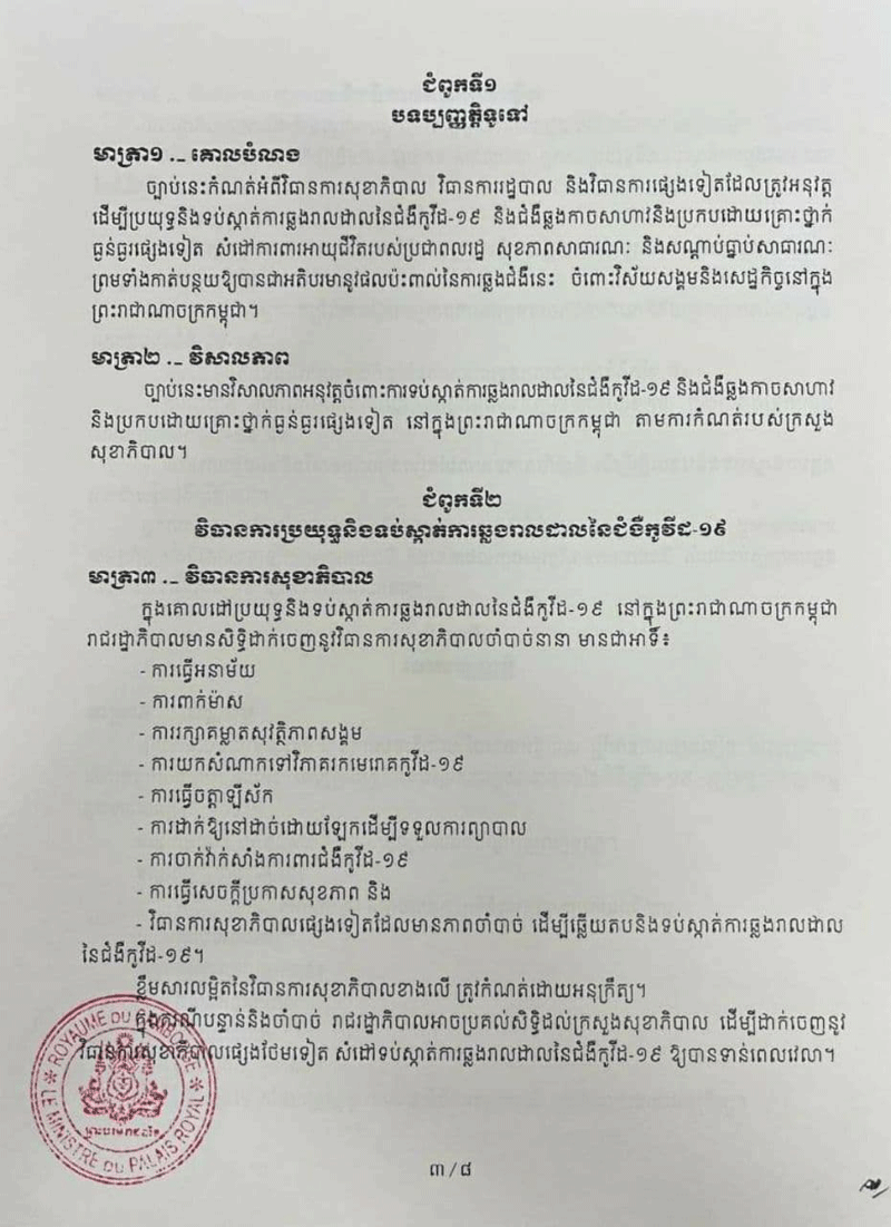 ច្បាប់នេះត្រូវបានធ្វើឡើង ដើម្បីកំណត់អំពីវិធានការសុខាភិបាល វិធានការរដ្ឋបាល និងវិធានការផ្សេង ទៀត ដែលត្រូវអនុវត្តដើម្បីប្រយុទ្ធ និងទប់ស្កាត់ការឆ្លងរាលដាលនៃជំងឺកូវីដ១៩ និងជំងឹឆ្លងកាច សាហាវ និងប្រកបដោយគ្រោះថ្នាក់ធ្ងន់ធ្ងរផ្សេងទៀត សំដៅការពារអាយុជីវិតរបស់ប្រជាពលរដ្ឋ សុខភាពសាធារណៈ និងសណ្តាប់ធ្នាប់សាធារណៈ ព្រមទាំងកាត់បន្ថយឱ្យបានជាអតិបរមានូវផល ប៉ះពាល់នៃការឆ្លងជំងឺនេះ ចំពោះវិស័យសង្គម និងសេដ្ឋកិច្ចនៅកម្ពុជា៕SKS