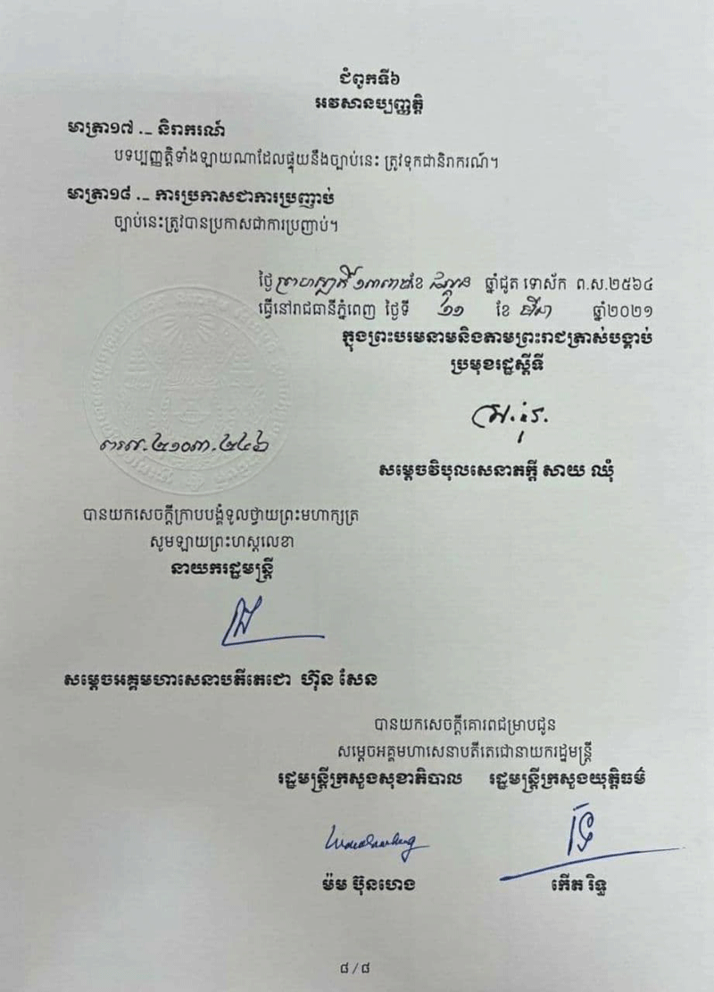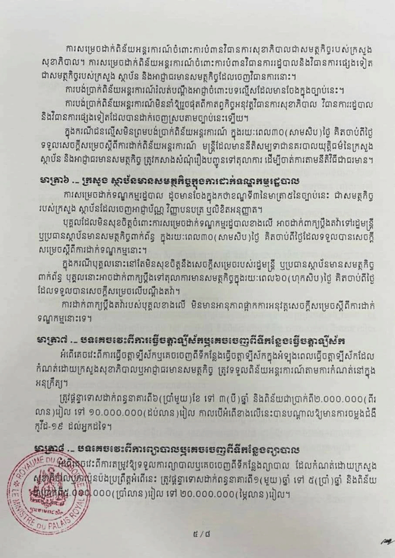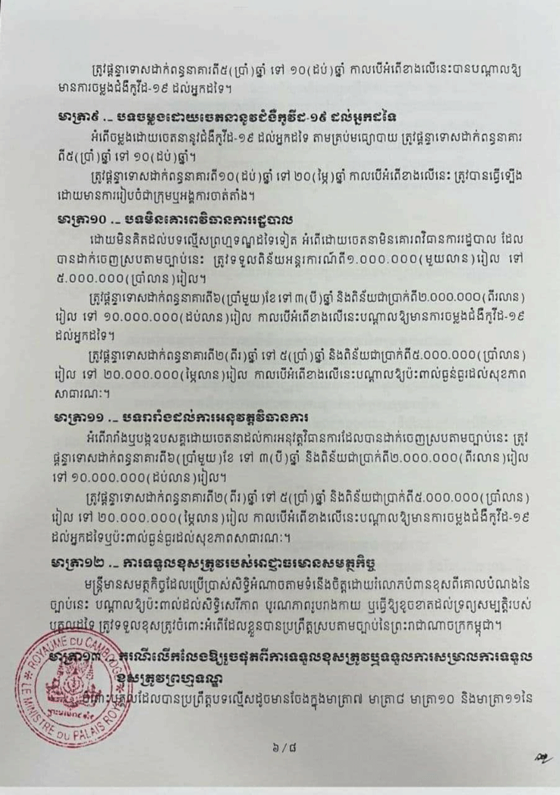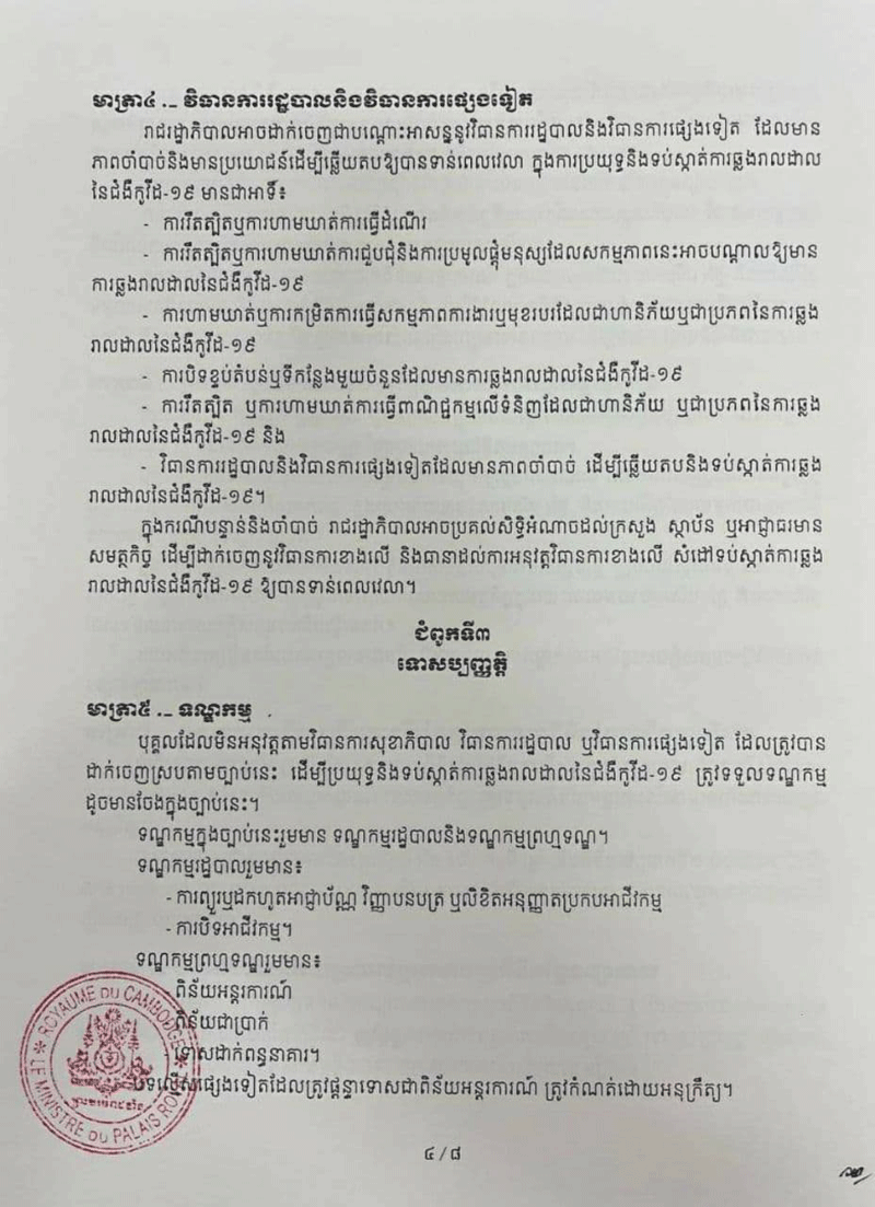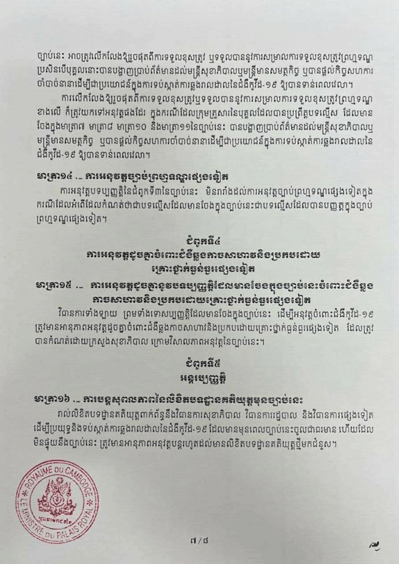 ច្បាប់ស្តីពី «វិធានការទប់ស្កាត់ការឆ្លងរាលដាលនៃជំងឺកូវីដ-១៩ និងជំងឺឆ្លងកាចសាហាវ និងប្រកប ដោយគ្រោះថ្នាក់ធ្ងន់ធ្ងរផ្សេងទៀត» ត្រូវបានប្រកាសឱ្យប្រើប្រាស់ជាផ្លូវការកាលពីថ្ងៃទី១១ ខែមីនា ឆ្នាំ២០២១កន្លងទៅនេះ។ ច្បាប់នេះមាន ៦ជំពូក និង១៨មាត្រា។