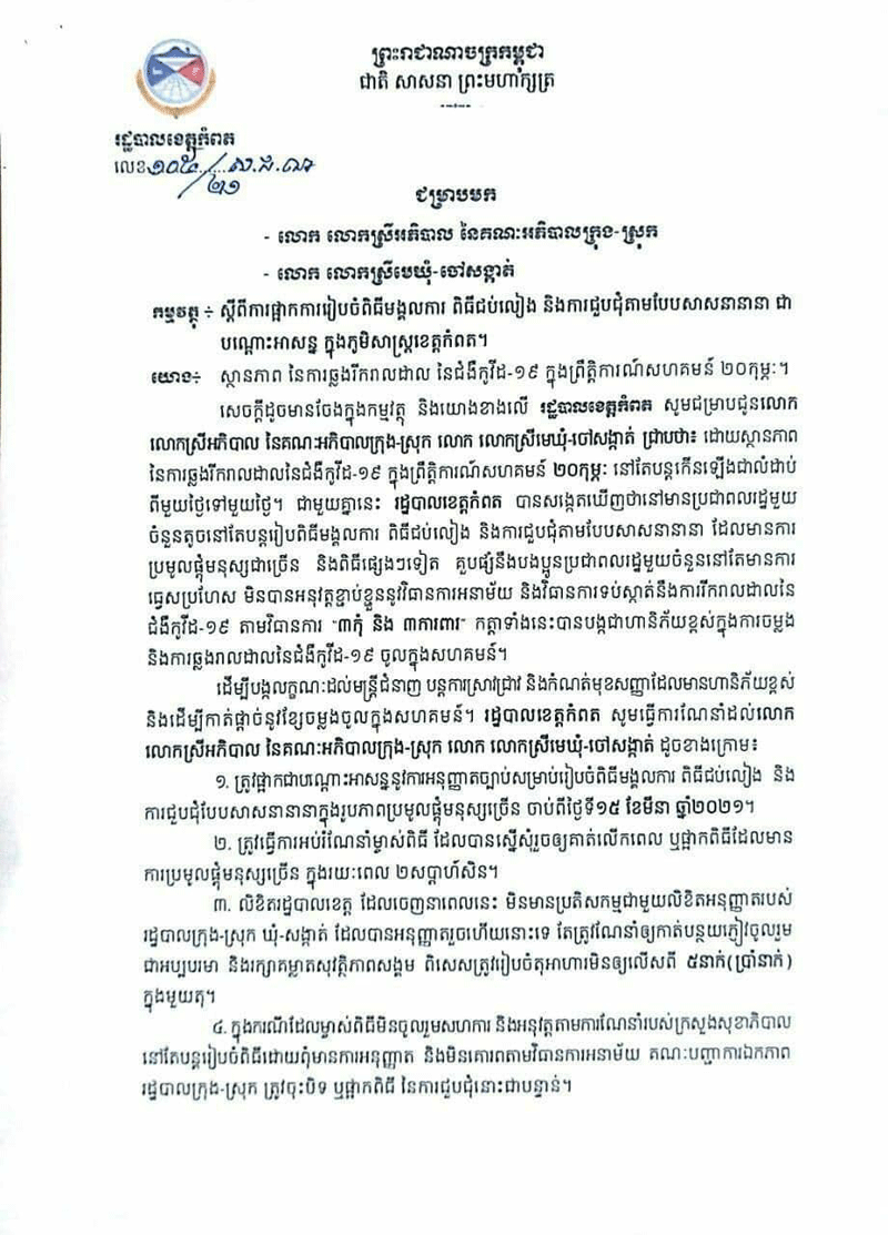 ខេត្តកំពត ៖នៅព្រឹកថ្ងៃទី ១៥ ខែមីនា ឆ្នាំ ២០២១ នេះ រដ្ឋបាលខេត្តកំពត បានចេញសេចក្ដីជូនដំណឹង ស្ដីអំពីការផ្អាកការរៀបចំពិធីមង្គលការ ពិធីជប់លៀង និង ការជួបជុំតាមបែបសាសនានានា ជាបណ្តោះអាសន្ន ក្នុងភូមិសាស្ត្រខេត្តកំពត ។
