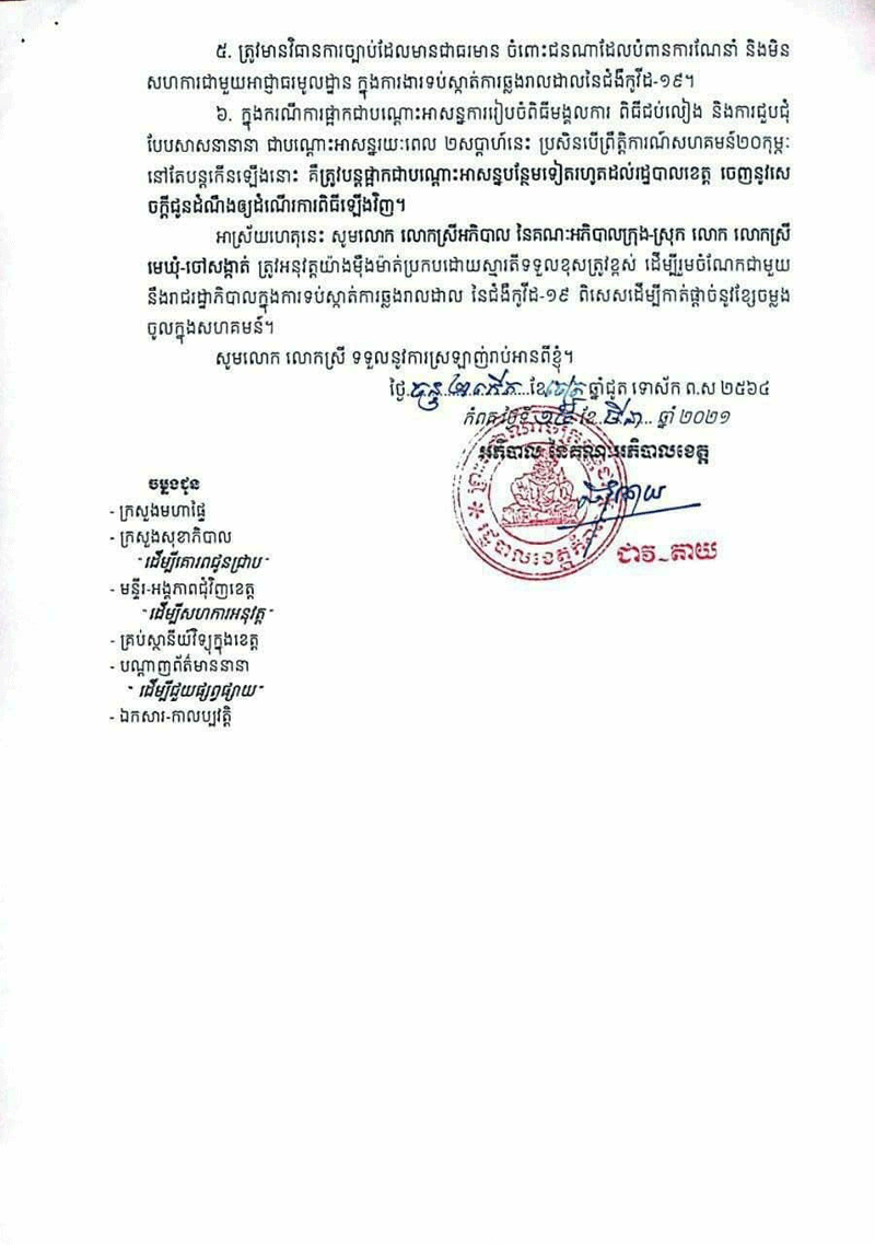 ៣. លិខិតរដ្ឋបាលខេត្ត ដែលចេញនាពេលនេះ មិនមានប្រតិសកម្មជាមួយលិខិតអនុញ្ញាតរបស់ រដ្ឋបាលក្រុង-ស្រុក ឃុំ-សង្កាត់ ដែលបានអនុញ្ញាតរួចហើយនោះទេ តែត្រូវណែនាំឲ្យកាត់បន្ថយ ភ្ញៀវចូលរួម ជាអប្បបរមា និង រក្សាគម្លាតសុវត្ថិភាពសង្គម ពិសេសត្រូវរៀបចំតុអាហារមិនឲ្យលើសពី ៥ នាក់(ប្រាំនាក់)ក្នុងមួយតុ។