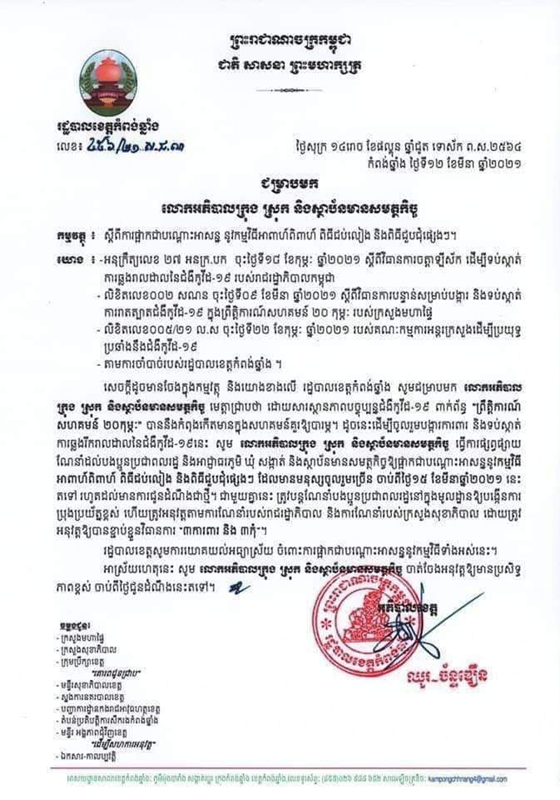ខេត្តកំពង់ឆ្នាំង:អាជ្ញាធរក្រុងកំពង់ឆ្នាំងបានចុះផ្អាកពិធីរៀបមង្គល់ការមួយនៅក្នុងសង្កាត់ផ្សារឆ្នាំងក្រុងកំពង់ឆ្នាំងដើម្បីទប់ស្កាត់រីករាលដាលជម្ងឺកូវិដ.១៩ ។ ការចុះផ្អាកសកម្មភាពមង្គល់ការខាង លើនេះបានធ្វើឡើងនៅថ្ងៃទី១៦មីនា២០២១នៅចំណុចភូមិចុងកោះ សង្កាត់ផ្សារឆ្នាំង ក្រុងនិងខេត្តកំពង់ឆ្នាំង ។អធិការនគបាលក្រុងកំពង់ឆ្នាំង វរះសេនីយ៍ឯក ឆាយរត្ន័ បានអោយដឹងថា ការចុះផ្អាកពិធីមង្គល់ការខាងលើនេះខណះដែលលោកអនុវត្តន៍ទៅតាមបញ្ជារបស់អភិបាលក្រុងកំពង់ឆ្នាំងលោកយិនសាវ៉េនអោយចុះធ្វើការផ្អាកភាពរៀបមង្គល់ការមួយកន្លែងដែលស្ថិតនៅចំណុចភូមិសង្កាត់ខាងលើដោយពន្យលណែនាំដល់ម្ចាស់មង្គលការគ្រាដែលអាជ្ញាធខេត្តបានចេញសេចក្តីណែនាំអោយផ្អាកជាបណ្តោះអាសន្ន៍នូវកម្មវិធីមង្គលការពិធ៏ជប់លៀងនិងពិធីជួបជុំផ្សេងៗនៅតាមបណ្តាក្រុង.ស្រុកទាំង៨ក្នុងខេត្តកំពង់ឆ្នាំងផងដែរ ។ អភិបាលក្រុងកំពង់ឆ្នាំងបានធ្វើការអំពាវនាវដល់ បងប្អូន ប្រជាពលរដ្ឋក៍ដូចជាអាជ្ញាធមូលដ្ឋានភូមិ.ឃុំសង្កាត់និងសុំត្ថកិច្ចសូមអោយផ្អាកជាបណ្តោះអាសន្ន៍នូវកម្មវិធីមង្គល់ការពិធីជលៀងនិងការជួបជុំផ្សេងៗដែលមានមនុស្សជួបជុំច្រើននៅតាមកន្លែងផ្សេងៗចាប់ពីពេលនេះតទៅរហូតដល់មានការជូនដំណឹងជាថ្មីវិញផងដែរ ដើម្បីចូលរួមទប់ស្កាត់នៃការរីករាល ដាលជម្ងឺកូវិច ១៩ទៅក្នុងសហគមន៍។អភិបាលក្រុងកំពង់ឆ្នាំងបានធ្វើការពន្យល់ ណែនាំ បងប្អូនប្រជាពលរដ្ឋបង្កើនការប្រុងប្រយត្ន័ខ្ពស់និងអនុវត្តន៍តាមការណែនាំរបស់ក្រសួងសុខាភិបាលនិងអនុវត្តវិធានការ៣កុំនិង៣ការពារនេះផងដែរ ៕ដោយលោកស្រីសានផល្លា