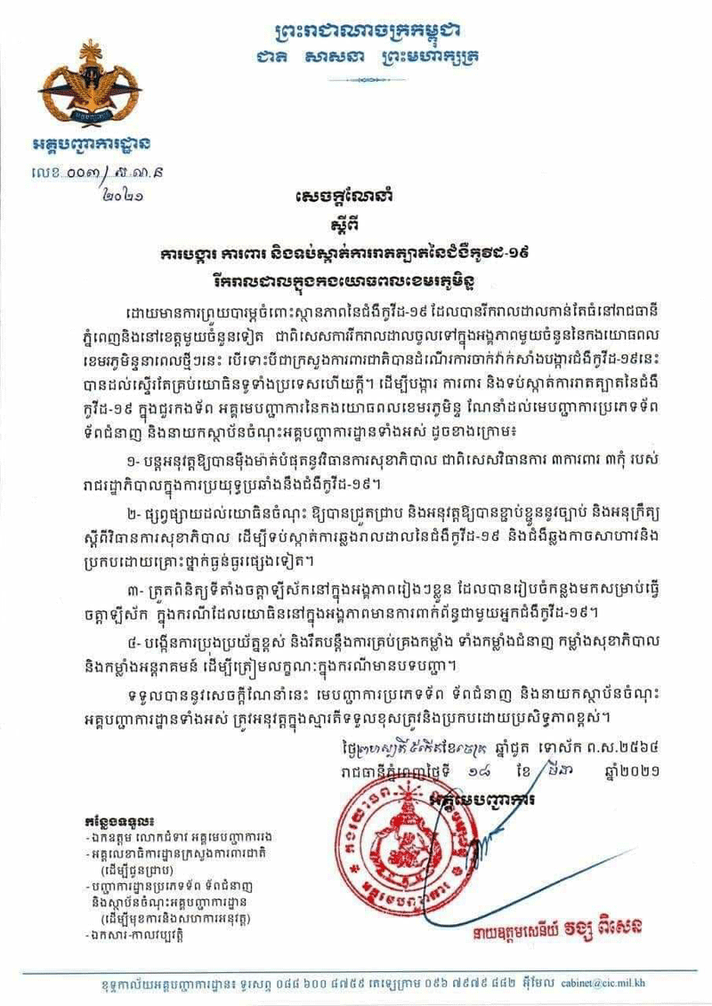 ភ្នំពេញៈ នាយឧត្ដមសេនីយ៍ វង្ស ពិសេន អគ្គមេបញ្ជាការនៃកងយោធពលខេមរភូមិន្ទ នៅថ្ងៃទី១៨ ខែមីនានេះ បានចេញសេចក្តីណែនាំស្ដីពីការបង្ការ ការពារ និងទប់ស្កាត់ការរាតត្បាតនៃជំងឺ កូវីដ-១៩ ក្នុងជួរកងទ័ព ដល់មេបញ្ជាការប្រភេទទ័ព ទ័ពជំនាញ និងនាយកស្ថាប័ន ចំណុះអគ្គបញ្ជាការដ្ឋាន ទាំងអស់ ដូចខាងក្រោម៖