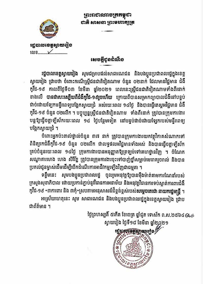 ខាងក្រោមនេះជាសេចក្តីជូនដំណឹងរបស់រដ្ឋបាលខេត្តស្វាយរៀងមានខ្លឹមសារដូចតទៅ៖