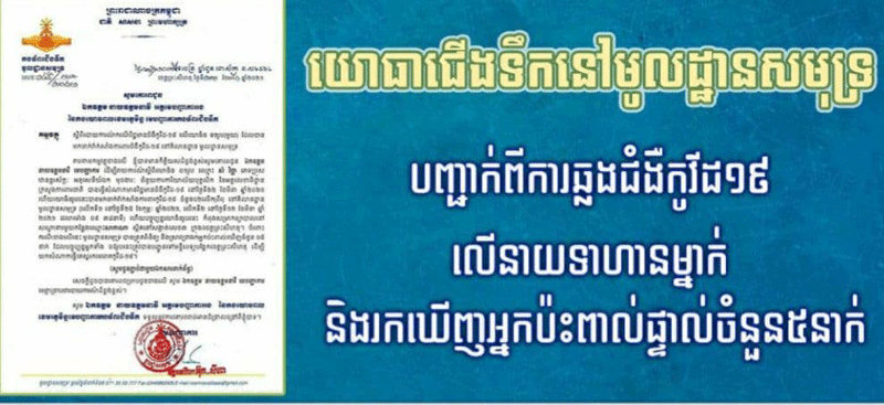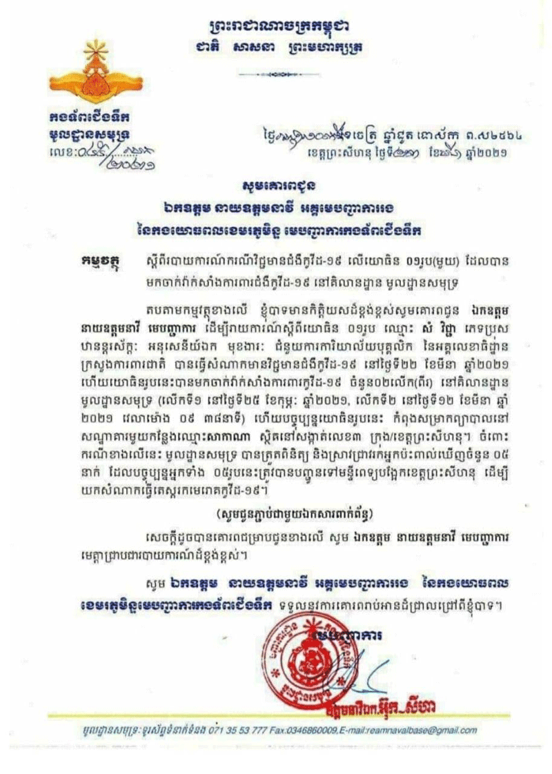 ព្រះសីហនុៈ លោកឧត្តមនាវីឯក អ៊ុក សីហា មេបញ្ជាការមូលដ្ឋានសមុទ្រ បានឲ្យដឹងថា មន្ដ្រីយោធារបស់មូលដ្ឋានសមុទ្រម្នាក់ ត្រូវបានរកឃើញថា ឆ្លងជំងឺកូវីដ-១៩។ នេះបើតាមលិខិតរបស់លោកឧត្តមនាវីឯក អ៊ុក សីហា ដែលបណ្ដាញព័ត៌មាន គេហ៌ទំព័រ សង្គមសន្តិភាព ទទួលបាននៅថ្ងៃទី២៣ ខែមីនា ឆ្នាំ២០២១ ដែលផ្ញើទៅនាយឧត្តមសេនីយ៍ នាវី ទៀ វិញ អគ្គមេបញ្ជាការរង នៃកងយោធពលខេមរភូមិន្ទ និងជាមេបញ្ជាការកងទ័ពជើងទឹក។លោកឧត្តមសេនីយ៍នាវីឯក អ៊ុក សីហា បានបញ្ជាក់ថា មន្ដ្រីយោធានោះ ឈ្មោះ សំ វិជ្ជា ភេទប្រុស ឋានន្ដរស័ក្ដ អនុសេនីយ៍ឯក មុខងារ ជំនួយការការិយាល័យបុគ្គលិក នៃអគ្គលេខាធិការដ្ឋានក្រសួងការពារជាតិ និងបានធ្វើសំណាកមានវិជ្ជមានជំងឺកូវីដ-១៩ នៅថ្ងៃទី២២ ខែមីនា ឆ្នាំ២០២១។លោកបានអះអាងថា មន្ដ្រីយោធានេះ បានមកចាក់វ៉ាក់សាំងការពារជំងឺកូវីដ-១៩ ចំនួន២លើក នៅគិលានដ្ឋានមូលដ្ឋានសមុទ្រ (លើកទី១ នៅថ្ងៃទី២៥ ខែកុម្ភៈ ឆ្នាំ២០២១, លើកទី២ នៅថ្ងៃទី១២ ខែមីនា ឆ្នាំ២០២១) ហើយបច្ចុប្បន្នយោធិនរូបនេះ កំពុងសម្រាកព្យាបាលនៅសណ្ឋាគារមួយក ន្លែងឈ្មោះ សាកាណា ស្ថិតក្នុងសង្កាត់លេខ៣ ក្រុងព្រះសីហនុ។