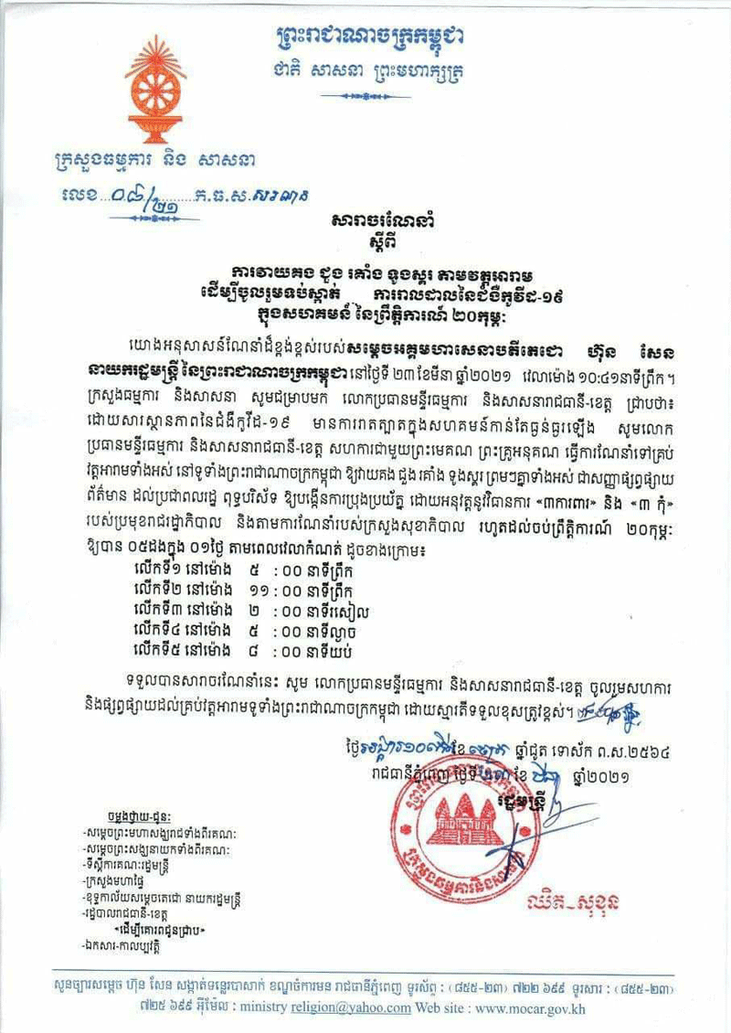 ខេត្តស្វាយរៀង៖យោងតាមអនុសាសន៍ណែនាំដ៏ខ្ពង់ខ្ពស់ របស់សម្ដេចអគ្គមហាសេនាបតីតេជោ ហ៊ុន សែន នាយករដ្ឋមន្ត្រីនៃព្រះរាជាណាចក្រកម្ពុជានិងយោងតាមសារាចរណែនាំរបស់ក្រសួងធម្មការ និងសាសនានិងចុះថ្ងៃទី២៣ខែមីនាឆ្នាំ២០២១បានចេញលិខិតប្រកាសព័ត៌មានឲ្យលោក ប្រធានមន្ទីរធម្មការនិងសាសនារាជធានីខេត្តជ្រាបថា ដោយសារស្ថានភាព នៃជំងឺកូវីដ១៩ មា នការរាតត្បាតក្នុងសហគមន៍កាន់តែធំឡើងសូមលោកប្រធានមន្ទីរធម្មការ និងសាសនារាជធានីខេត្តសហការជាមួយព្រះគុណព្រះគ្រូអនុគណៈធ្វើការណែនាំដល់គ្រប់វត្តអារាមទាំងអស់នៅទូទាំងប្រទេសឲ្យ វាយគង ជួង រគាំង ទូងស្គរព្រមគ្នាទាំងអស់ជាសញ្ញាផ្សព្វផ្សាយ ព័ត៌មានដល់ប្រជាពលរដ្ឋពុទ្ធបរិស័ទឲ្យបង្កើនការប្រុងប្រយ័ត្ន ដោយអនុវត្តវិធានការ ៣ ការពារនិង ៣កុំរបស់ប្រមុខរដ្ឋាភិបាល និងតាមការណែនាំរបស់ក្រសួងសុខាភិបាលរហូតចប់ព្រឹត្តិការណ៍២០កម្ភៈ ឲ្យបាន ៥ដងក្នុងមួយថ្ងៃ។ ហើយនៅវេលាម៉ោង៥ៈ០០នាទីព្រឹកថ្ងៃទី២៤ខែមិនាឆ្នាំ២០២១ នៅវត្តព្រៃតាអីស្ថិតក្នុងភូមិព្រៃតាប៉ោញ ឃុំ ព្រៃតាអី ស្រុក ស្វាយទាប ខេត្តស្វាយរៀងក៏មានការ ព្រះសង្ឃឡើងសូត្រមន្តសុំសេចក្តីសុខនិងទូងស្គរសញ្ញាផ្សព្វផ្សាយព័ត៌មានដល់ប្រជាពលរដ្ឋពុទ្ធបរិស័ទឲ្យបង្កើនការប្រុងប្រយ័ត្ន ដោយអនុវត្តវិធានការ ៣ ការពារនិង ៣កុំរបស់ប្រមុខរដ្ឋាភិបាល និងតាមការណែនាំរបស់ក្រសួងសុខាភិបាលផង។សារាចរណែនាំនោះបានឲ្យដឹងទៀតថា ពេលវេលាដែលត្រូវវាយគងជួងរគាំងទូងស្គរក្នុង១ថ្ងៃ៥ដងនោះរួមមានលើក ទី១ នៅម៉ោង៥ព្រឹក លើកទីពីរនៅម៉ោង១១ព្រឹក លើកទី៣ នៅម៉ោង ២រសៀល លើកទី៤ម៉ោង៥ ល្ងាចនិងលើក៥ នៅម៉ោង៨ យប់៕ដោយ មិន ភក្ដី