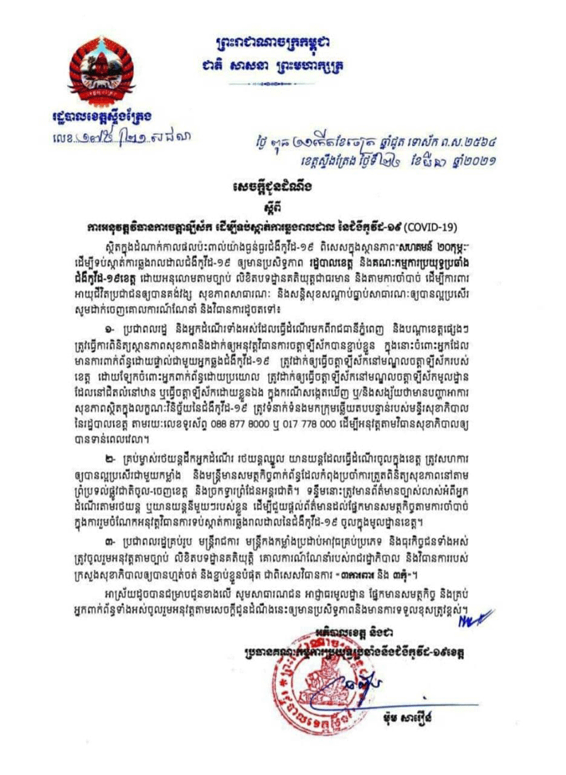 ខេត្តស្ទឹងត្រែងៈ យោងតាមសារលិខិតរបស់ រដ្ឋបាលខេត្តស្ទឹងត្រែង នៅថ្ងៃទី២៤ ខែមីនា ឆ្នាំ២០២១ ចេញសេចក្តីជូនដំណឹងស្តីពី ការអនុវត្តវិធានការចត្តាឡីស័ក ដើម្បីទប់ស្កាត់ការឆ្លងរាលដាល នៃជំងឺកូវីដ-១៩ ឲ្យមានប្រសិទ្ធភាព រដ្ឋបាលខេត្តបានអនុលោមតាមច្បាប់ លិខិតបទដ្ឋានគតិយុត្ត ជាធរមាន និងតាមការចាំបាច់ ដើម្បីការពារអាយុជីវិតប្រជាជនឲ្យបានគង់វង្ស សុខភាពសាធារណៈ និងសន្តិសុខសណ្ដាប់ធ្នាប់សាធារណៈឲ្យបានល្អប្រសើរ សូមដាក់ចេញគោលការណ៍ណែនាំ និងវិធានការដូចតទៅ៖ ១. ប្រជាពលរដ្ឋ និងអ្នកដំណើរទាំងអស់ដែលធ្វើដំណើរមកពីរាជធានីភ្នំពេញ ឬតាមបណ្ដាខេត្តផ្សេងៗ ត្រូវពិនិត្យសុខភាព និងធ្វើចត្តាឡីស័ក ក្នុងនោះចំពោះអ្នកដែលបាន ប៉ះពាល់ផ្ទាល់ជាមួយអ្នកជំងឺកូវីដ១៩ ត្រូវដាក់ឲ្យធ្វើចត្តាឡីស័កនៅមណ្ឌលចត្តាឡីស័ករបស់ខេត្ត ដោយឡែកអ្នកប៉ះពាល់ប្រយោង ត្រូវដាក់ធ្វើចត្តាឡីស័កនៅមណ្ឌលមូលដ្ឋាន ដែលនៅជិតលំនៅឋាន ឬធ្វើចត្តាឡីស័កដោយខ្លួនឯង។ ២. គ្រប់ម្ចាស់រថយន្តដឹកអ្នកដំណើរ រថយន្តឈ្មួល យានយន្តធ្វើ ដំណើរចូលមកក្នុងខេត្ត ត្រូវសហការជាមួយសមត្ថកិច្ចឲ្យបានល្អប្រសើរ ទន្ទឹមនឹងនោះត្រូវមាន ព័ត៌មានច្បាស់លាស់អំពីអ្នកដំណើរនៅក្នុងរថយន្ត ចំនួនមនុស្សនីមួយៗរបស់ខ្លួន ដើម្បីងាយស្រួល ផ្ដល់ព័ត៌មានដល់សមត្ថកិច្ច ចាំបាច់ក្នុងការរួមចំណែកអនុវត្តវិធានការទប់ស្កាត់ការឆ្លងនៃជំងឺកូវីដ-១៩ ។៣. ប្រជាពលរដ្ឋគ្រប់រូប មន្ត្រីរាជការកម្លាំងប្រដាប់អាវុធគ្រប់ប្រភេទ និងធុរកិច្ចជនទាំងអស់ ត្រូវចូល រួមអនុវត្តតាមច្បាប់ និងវិធានការរបស់ក្រសួងសុខាភិបាល និងជាពិសេសវិធានការ “៣ការពារ និង៣កុំ” ៕SKS