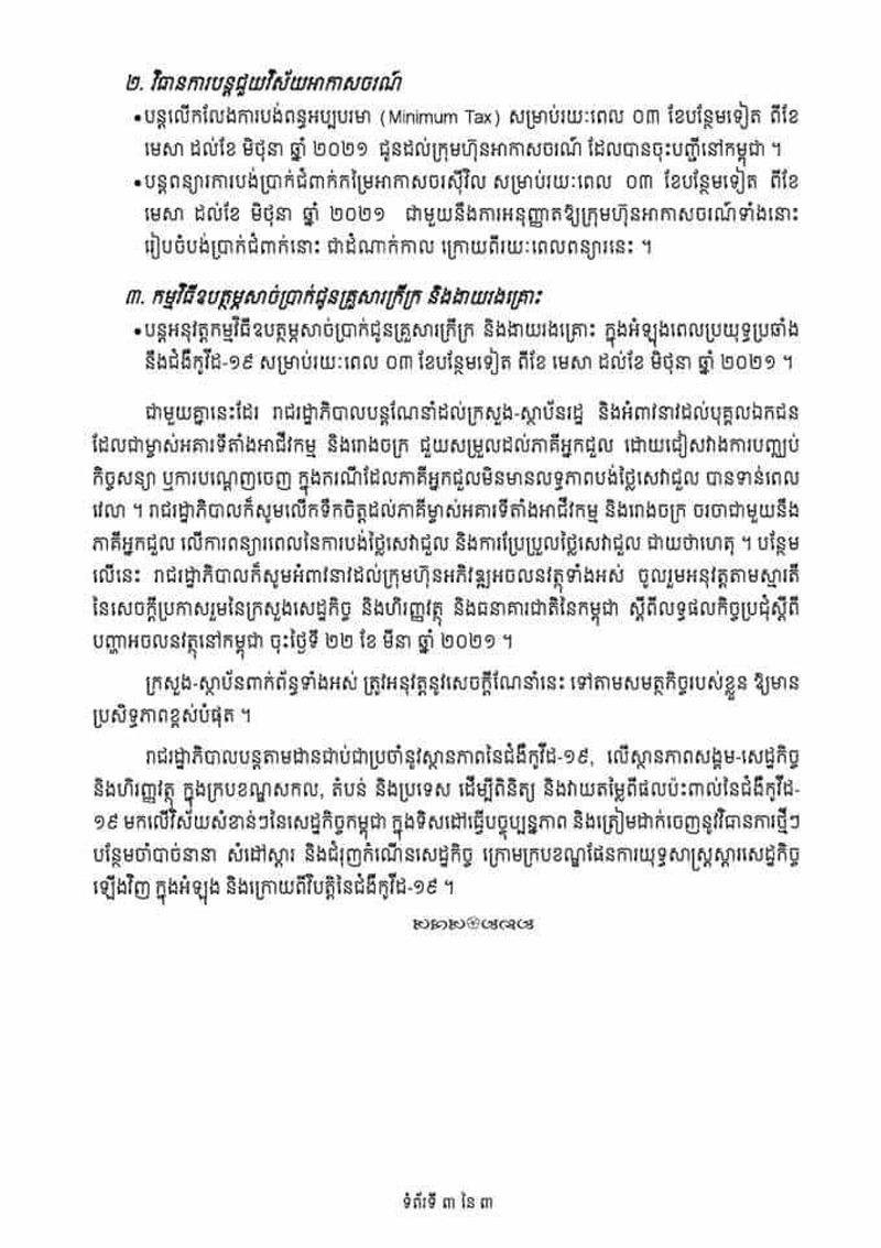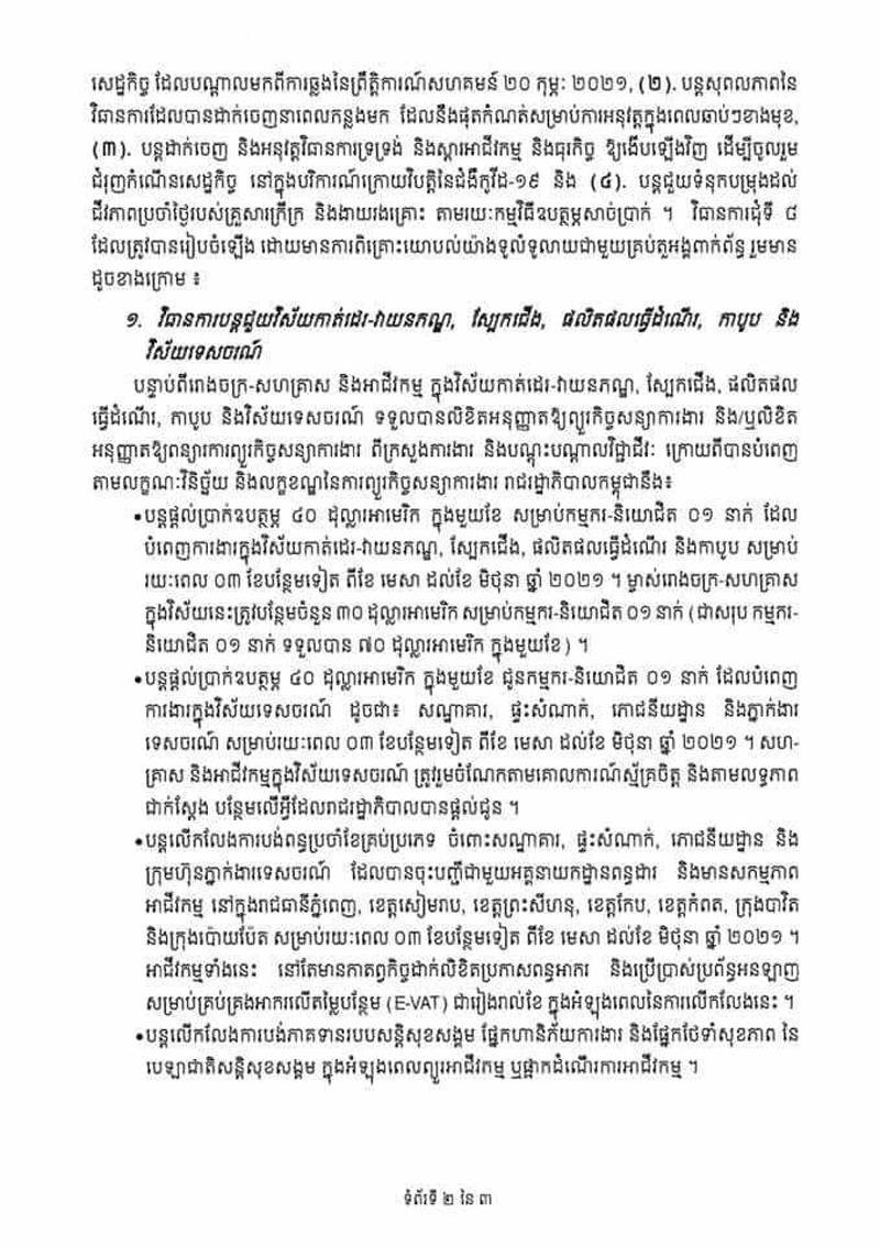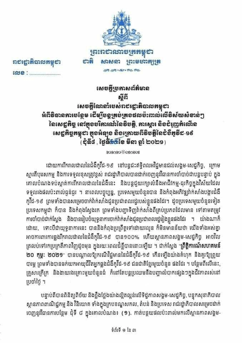 នេះបើតាមសេចក្តីប្រកាសព័ត៌មាន ស្តីពីការដាក់ចេញវិធានការបន្ថែម បន្តគ្រប់គ្រងផលប៉ះពាល់ លើវិស័យសំខាន់ៗ ដើម្បីស្ដារ និងជំរុញកំណើនសេដ្ឋកិច្ចកម្ពុជា ពីវិបត្តិនៃជំងឺកូវីដ១៩ (ជុំទី៨)