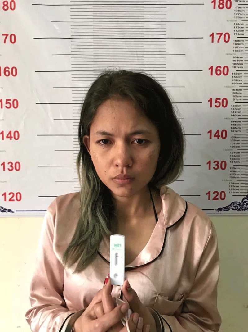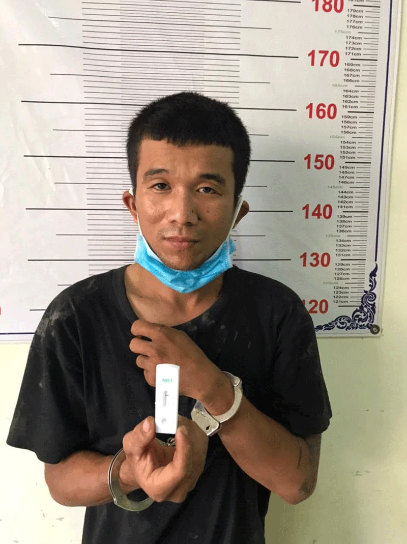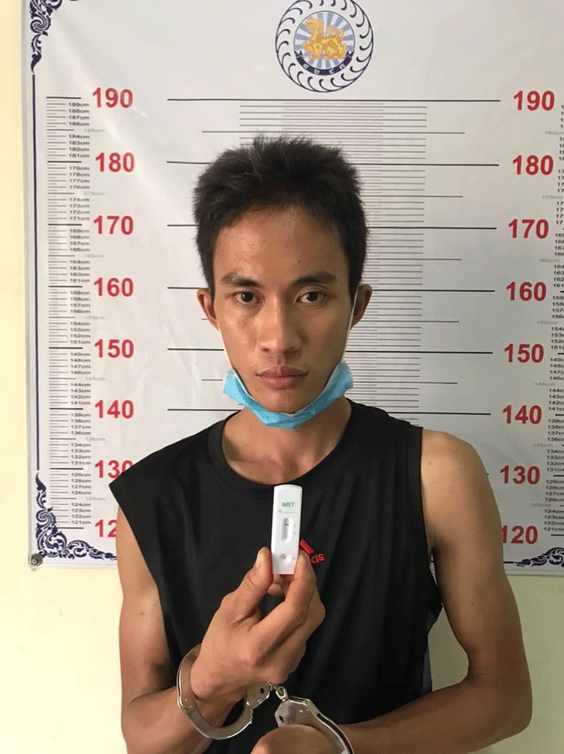 ដោយមានការសង្ស័យកម្លាំងប៉ូលិសបានឃាត់ និងឆែកឆេរលើខ្លួនប្រាណរកឃើញថ្នាំញៀន(ម៉ាទឹកកក)ចំនួន០១កញ្ចប់ធំនៅហ្នឹងខ្លួនជនសង្ស័យ,ភ្លាមនោះកម្លាំងប៉ូលិសបានឃាត់យកជនសង្ស័យមកប៉ុស្តិ៍រដ្ឋបាលដីឥដ្ឋ ដើម្បីសួរនាំ ។