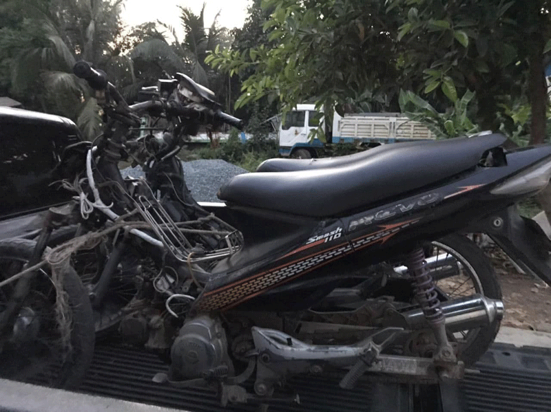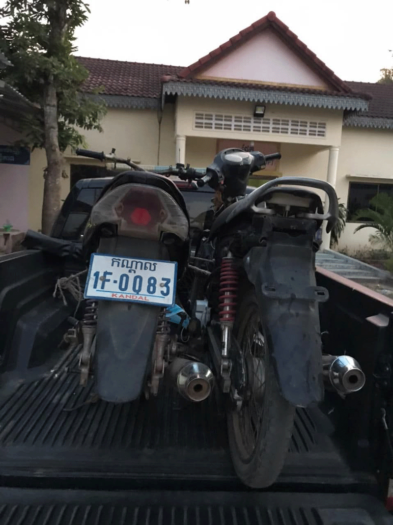 វត្ថុតាងចាប់យករួមមាន ១-ម្សៅក្រាមពណ៌សថ្លាសង្ស័យសារធាតុញៀន(ម៉ាទឹកកក)ចំនួន ០៣កញ្ចប់,(ធំ០១កញ្ចប់-មធ្យម០២កញ្ចប់),២-ទូរស័ព្ទដៃចំនួន០៣គ្រឿង(ខូច០៣គ្រឿង), ៣- ស្លាកលេខម៉ូតូចំនួន០១(ភ្នំពេញ1R1747),៤-ម៉ូតូចំនួន០២គ្រឿង(ម៉ាកស៊ុយសូគីស្មាសរីវ៉ូ)ពណ៌ខ្មៅ ស៊េរី២០០៨ ពាក់ស្លាកលេខ កណ្តាល1S-0083 គ្មានកង់ក្រោយ គ្មានក្បាំង គ្មានកុងទ័រ គ្មានកញ្ចក់(០១គ្រឿង),(ម៉ាកស៊ុយសូគីស្មាសរីវ៉ូ)ពណ៌ខ្មៅ គ្មានផ្លាកលេខ គ្មានអាវមុខក្រោយ គ្មានកញ្ចក់(០១គ្រឿង)និង៥-កាត់វីងចំនួន០១សន្លឹក រួមជាមួយសម្ភារៈប្រើប្រាស់មួយចំនួន។