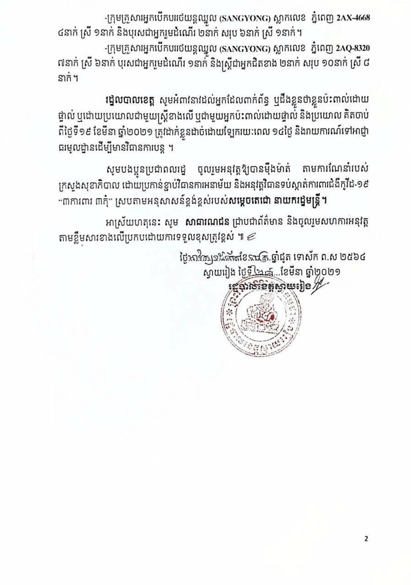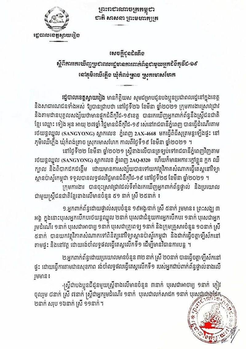 រដ្ឋបាលខេត្តស្វាយរៀង សូមជម្រាបជូនដំណឹងស្តីពីការរកឃើញប្រជាពលរដ្ឋមានការពាក់ព័ន្ធ ជាមួយអ្នកជំងឺកូវីដ១៩ នៅភូមិឈើភ្លើង ឃុំកំពង់ត្រាច ស្រុករមាសហែក admin — 28/03/2021 in ព័ត៌មានជាតិ 47 Likes 549 Views Share Tweet on Twitter Share on Facebook Google+ Pinterest