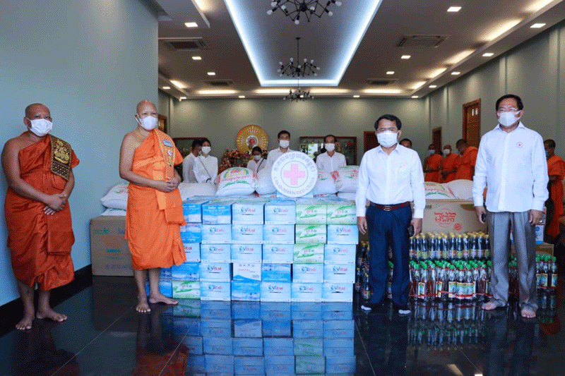 ខេត្តកណ្តាល៖ ឯកឧត្តម គង់ សោភ័ណ្ឌ អភិបាល នៃគណៈអភិបាលខេត្តកណ្តាល និងជាប្រធានគណៈកម្មាធិការសាខាកាកបាទក្រហមកម្ពុជាខេត្ត ព្រមទាំងមន្ត្រីរាជការ នៅរសៀលថ្ងៃទី២៧ ខែមីនា ឆ្នាំ២០២១ បាននាំយកអំណោយមនុស្សធម៍ របស់សាខាកាកបាទក្រហមកម្ពុជាខេត្តខេត្តកណ្ដាល រួមមាន៖ អង្ករ ១០០ប៉ាវ ស្មើនឹង៥០០០kg មី ៦០កេស ទឹកត្រី ២០យូរ ទឹកស៊ីអ៉ីវ ២០យូរ ត្រីខ ៥០យូរ ទឹកសុទ្ធ ១០០កេស អាកុល ៦០លីត្រ ម៉ាស ២៥០០បន្ទះ និងថវិកា ១០លានរៀល មកប្រគេនដល់វត្តសុវណ្ណវារី ហៅវត្តព្រែកតាទែន ស្ថិតនៅឃុំព្រែកតាទែន ស្រុកពញាឮ ដើម្បីជាការជួយសម្រួលដល់ការផ្គត់ផ្គង់នូវចង្ហាន់ សម្រាប់ព្រះសង្ឈ ក្នុងស្ថានភាពដែលប្រទេសកម្ពុជា កំពុងជួបវិបត្តិជំងឺកូវីដ-១៩។បន្ទាប់មក ឯកឧត្តមអភិបាលខេត្ត ក៏បានអញ្ជើញចូលរួមក្នុងចូលរួមក្នុងពិធីបុណ្យចម្រើនព្រះជន្ម សម្ដេចព្រះឧត្តមមុនី ជា សំអាង ព្រះមេគណខេត្តកណ្ដាល និងជាព្រះគ្រូចៅអធិការ វត្តសុវណ្ណវារី ហៅវត្តព្រែកតាទែន គម្រប់ខួប៦៧ ឈានចូល ៦៨ព្រះវស្សាផងដែរ។