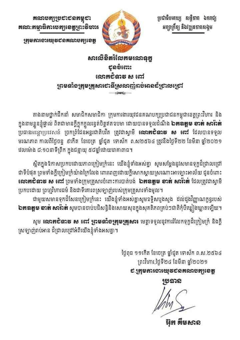 លោកឧកញ៉ា អ៊ុក គឹមសាន ប្រធានក្រុមការងារយុវជនគណបក្សប្រជាជនកម្ពុជា ខេត្តព្រះវិហារ ផ្ញើសារលិខិតរំលែកទុក្ខជូនចំពោះលោកជំទាវ ស ពៅ។