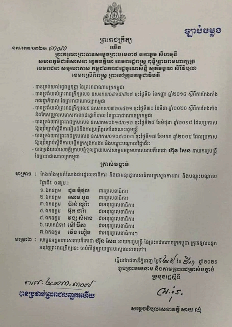ភ្នំពេញៈ សម្ដេចវិបុលសេនាភក្ដី សាយ ឈុំ ប្រមុខរដ្ឋស្ដីទី នៅថ្ងៃទី២៩ ខែមីនា ឆ្នាំ២០២១ បានចេញព្រះរាជក្រឹត្យត្រាស់បង្គាប់តែងតាំង រដ្ឋលេខាធិការ និងអនុរដ្ឋលេខាធិការ ក្រសួងការងារ និងបណ្ដុះបណ្ដាលវិជ្ជាជីវៈ សរុបចំនួន៧រូប។