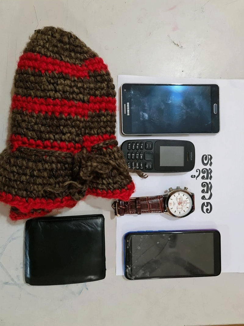 វត្ថុតាងចាប់យក ទូរស័ព្ទដៃចំនួន៣គ្រឿង(1-ម៉ាកSAMZUNG A7ពណ៌ខ្មៅ ,2-ម៉ាកICaLLពណ៌ខៀវ និង3-ម៉ាកNOKIA105ពណ៌ខ្មៅរបស់ជនសង្ស័យ), នាឡិកាដៃម៉ាកLONGBOខ្សែពណ៌ឈាមជ្រូក ១គ្រឿង ជារបស់ជនសង្ស័យ,មួកចាក់ឆ្នួតក្រហមចំនួន១ ,កាបូបដៃពណ៌ខ្មៅ១និងលុយ១៣០០រៀល (របស់ជនសង្ស័យ)។