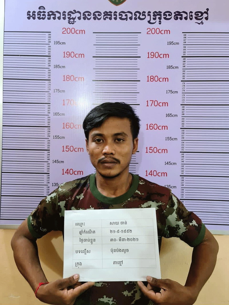 កណ្តាល ៖ បុរសម្នាក់បានឡើងលើផ្ទះជាន់លើដើរអើតមើលតាមបន្ទប់ជួលបម្រុងធ្វើសកម្មភាពលួច ត្រូវបានម្ចាស់ផ្ទះជួលមើលឃើញតាមកាមេរ៉ាសុវត្ថិភាពឃាត់ខ្លួន រួចប្រគល់ឱ្យប៉ូលិសក្រុងតាខ្មៅ នាថ្ងៃ២៩ខែមីនាឆ្នាំ២០២១វេលាម៉ោង១១និង៣០នាទីយប់នៅ ចំណុចផ្ទះជនរងគ្រោះ ភូមិកំពង់សំណាញ់ សង្កាត់កំពង់សំណាញ់ ក្រុងតាខ្មៅ ខេត្តកណ្តាល