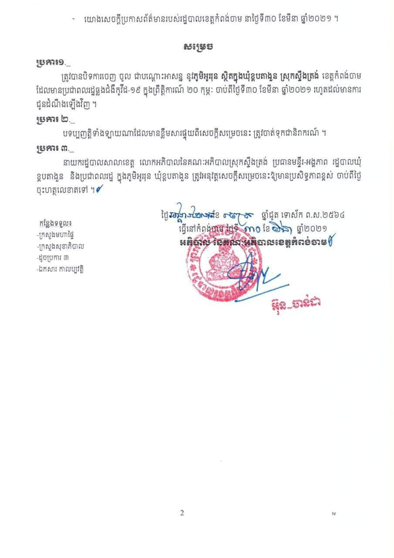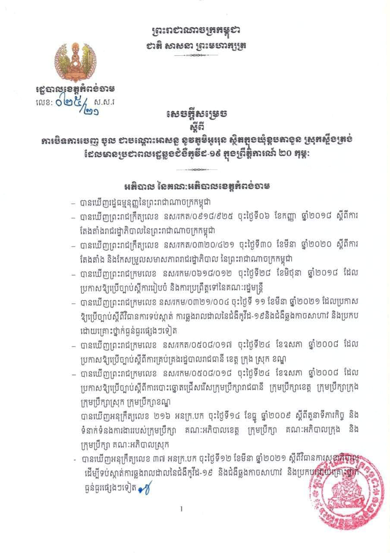 សេចក្តីសម្រេចរបស់រដ្ឋបាលខេត្តកំពង់ចាម ស្ដីពីការបិទចេញ-ចូលជាបណ្ដោះអាសន្នភូមិអូររុន ឃុំខ្ពបតាងួន ស្រុកស្ទឹងត្រង់ admin — 30/03/2021 in ព័ត៌មានជាតិ 44 Likes 241 Views Share Tweet on Twitter Share on Facebook Google+ Pinterest