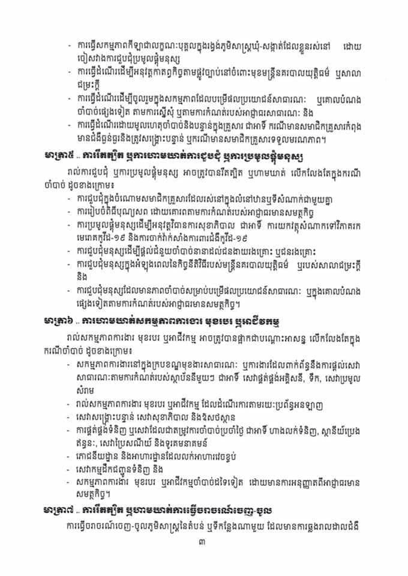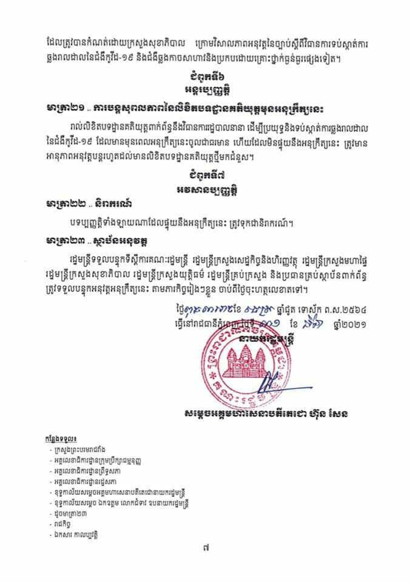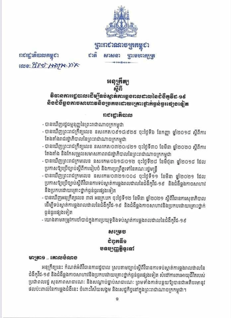 អនុក្រឹត្យថ្មីនេះ ត្រូវបានសម្តេចតេជោ ហ៊ុន សែន ចុះហត្ថលេខា កាលពីល្ងាចថ្ងៃទី៣១ ខែមីនា ឆ្នាំ២០២១នេះ។ មាត្រា៨ ស្តីពី បម្រាមគោចរ កំណត់ថា « រាល់ការធ្វើដំណើរ ដែលត្រូវបានអនុញ្ញាត ដូចមានចែង ក្នុងមាត្រា៤ នៃអនុក្រឹត្យនេះ មិនត្រូវ ធ្វើឡើងនៅចន្លោះពីម៉ោង ២០ ( ម្ភៃ ) ដល់ម៉ោង ៥ ( ប្រាំ ) លើកលែងចំពោះការធ្វើដំណើរ ដោយមូលហេតុសុខភាពបន្ទាន់ មូលហេតុចាំបាច់ និងបន្ទាន់ក្នុងគ្រួសារ ការដឹកជញ្ជូនទំនិញ ការបំពេញកាតព្វកិច្ច ដែលបម្រើ ផលប្រយោជន៍សាធារណៈ ការធ្វើដំណើរទៅទីកន្លែង បំពេញការងារនៅក្នុងសហគ្រាស គ្រឹះស្ថាន ឬទីតាំង អាជីវកម្ម ដែលត្រូវបានលើកលែង ឲ្យបើកដំណើរ ការដូចមានចែង ក្នុងកថាខណ្ឌ ខាងក្រោមនេះ និងករណី ចាំបាច់ ដទៃទៀត ដោយមាន ការអនុញ្ញាត ពី អាជ្ញាធរ មានសមត្ថកិច្ច »។បម្រាមគោចរដដែល កំណត់ថា «រាល់គ្រឹះស្ថាន សាធារណៈ សហគ្រាស ឬគ្រឹះស្ថានឯកជន ឬទីតាំងអាជីវកម្ម ដែលត្រូវ បានអនុញ្ញាត ឲ្យនៅបើកដំណើរការស្របតាមមាត្រា៦ នៃអនុក្រឹត្យនេះ ត្រូវផ្អាកប្រតិបត្តិការ របស់ខ្លួនចាប់ពីម៉ោង ២០ ( ម្ភៃ ) ដល់ម៉ោង ៥ ( ប្រាំ ) សម្រាប់ទទួលអតិ ថិជន ដោយផ្ទាល់ លើកលែងចំពោះ សេវាសង្គ្រោះបន្ទាន់ សេវាសុខាភិបាល ឱសថស្ថាន ស្ថានីយ៍ប្រេង ឥន្ធនៈ និងសេវាសាធារណៈចាំបាច់ដទៃទៀត ដោយមានការអនុញ្ញាត ពីអាជ្ញាធរមានសមត្ថកិច្ច»។ អនុក្រឹត្យ ស្តីពី វិធានការរដ្ឋបាល ដើម្បីទប់ស្កាត់ ការឆ្លងរាលដាលនៃជំងឺកូវីដ១៩ និង ជំងឺ ឆ្លង កាច សា ហាវ និង ប្រកបដោយ គ្រោះថ្នាក់ ធ្ងន់ធ្ងរ ផ្សេង ទៀត បានកំណត់ពីវិធានការ នានា ចាំបាច់ ដែល ត្រូវ អនុវត្ត មានជាអាទិ៍៖ ១-ការរឹតត្បិត ឬការហាមឃាត់ ការធ្វើដំណើរ ២-ការរឹតត្បិត ឬការហាមឃាត់ ការជួបជុំ និងការប្រមូលផ្តុំ មនុស្ស ដែលសកម្មភាពនេះ អាចបណ្តាល ឲ្យមានការឆ្លងរាលដាលនៃជំងឺកូវីដ១៩ ៣-ការហាមឃាត់ ឬការកម្រិត ការធ្វើសកម្មភាព ការងារ ឬមុខរបរ ដែលជាហានិភ័យ ឬជាប្រភព នៃការឆ្លងរាលដាល នៃជំងឺកូវីដ១៩ ៤-ការរឹតត្បិត ឬហាមឃាត់ ការធ្វើចរាចរណ៍ចេញ-ចូលតំបន់ ឬទីកន្លែង ដែល មាន ការឆ្លងរាលដាល នៃជំងឺកូវីដ១៩ ៥-បម្រាមគោចរ ៦-ការបិទ ខ្ទប់តំបន់ ឬទីកន្លែង ដែលមានការឆ្លងរាលដាល នៃជំងឺកូវីដ១៩ ៧-ការរឹតត្បិត ឬការហាមឃាត់ ការធ្វើពាណិជ្ជកម្ម លើទំនិញ ដែលជាហានិភ័យ ឬជាប្រភេទ នៃការឆ្លង រាលដាល នៃជំងឺកូវីដ១៩ និង វិធានការរដ្ឋបាល ផ្សេងទៀត ដែល មានភាពចាំបាច់ ដើម្បីឆ្លើយតប និងទប់ស្កាត់ ការឆ្លងរាលដាលនៃ ជំងឺកូវីដ១៩ ។ អនុក្រឹត្យនេះ ក៏បានកំណត់ ថា «គណៈអភិបាលរាជធានីខេត្ត ត្រូវបានប្រគល់សមត្ថកិច្ច ក្នុងការសម្រេចដាក់ចេញវិធានការ រដ្ឋបាលណាមួយ ដែល មានវិសាលភាព អនុវត្ត សម្រាប់ ផ្នែកខ្លះ ឬទីកន្លែងខ្លះ ក្នុងដែនដីនៃរាជធានីខេត្ត ឬមានវិសាលភាពអនុវត្ត ទូទាំ