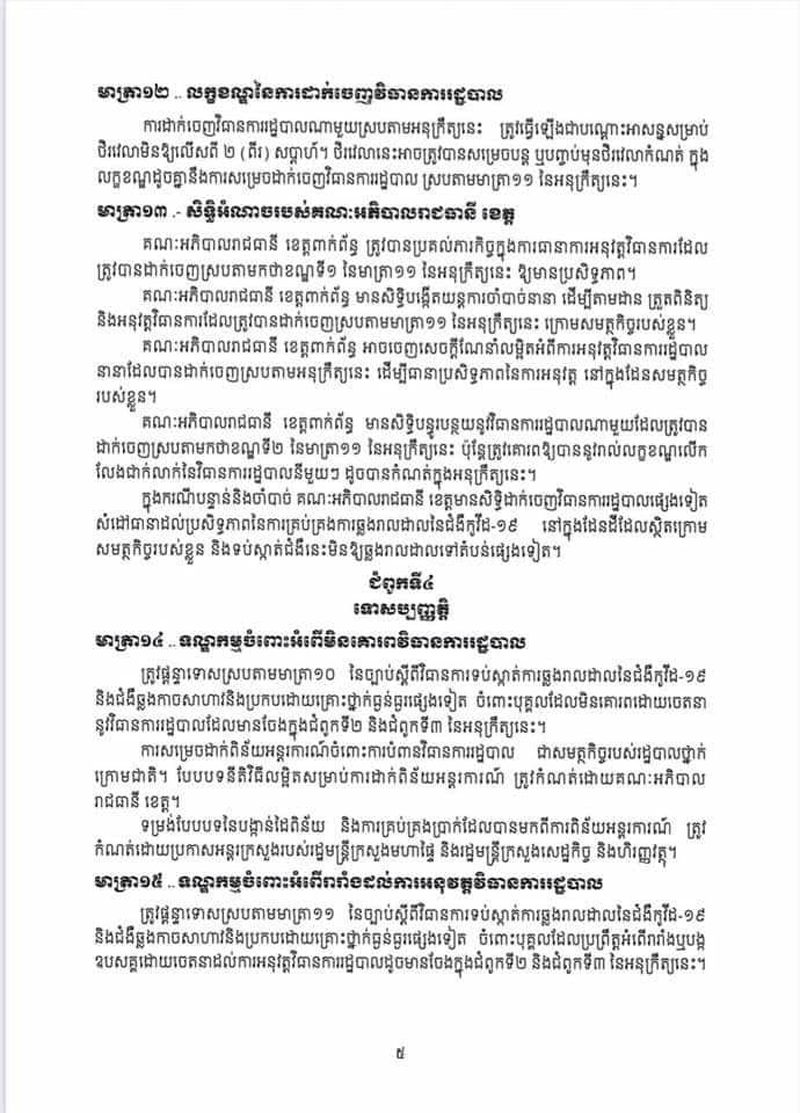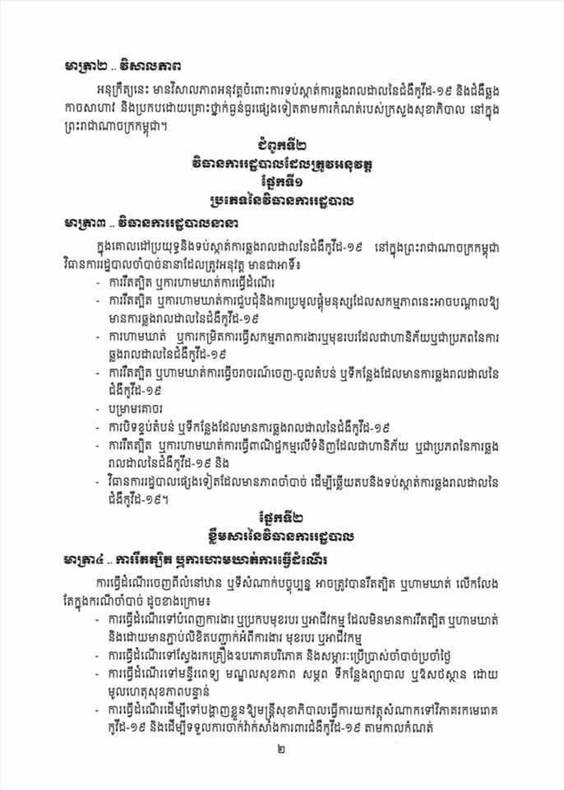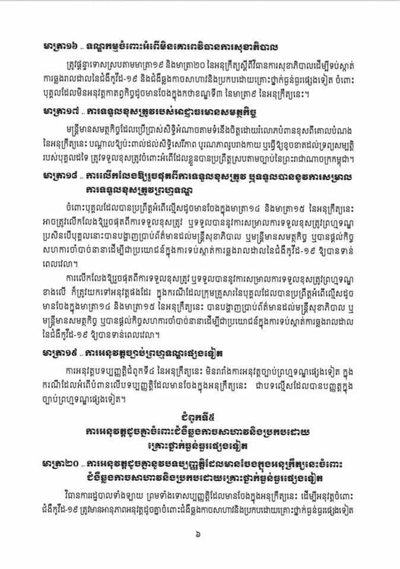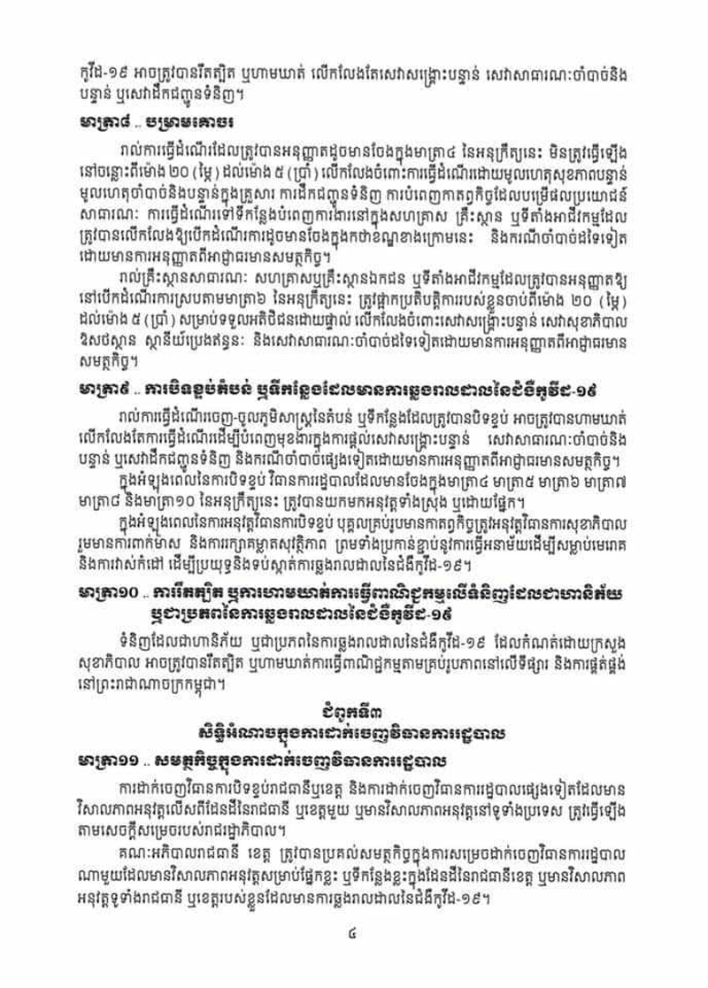 អនុក្រឹត្យថ្មីនេះ ត្រូវបានសម្តេចតេជោ ហ៊ុន សែន ចុះហត្ថលេខា កាលពីល្ងាចថ្ងៃទី៣១ ខែមីនា ឆ្នាំ២០២១នេះ។ មាត្រា៨ ស្តីពី បម្រាមគោចរ កំណត់ថា « រាល់ការធ្វើដំណើរ ដែលត្រូវបានអនុញ្ញាត ដូចមានចែង ក្នុងមាត្រា៤ នៃអនុក្រឹត្យនេះ មិនត្រូវ ធ្វើឡើងនៅចន្លោះពីម៉ោង ២០ ( ម្ភៃ ) ដល់ម៉ោង ៥ ( ប្រាំ ) លើកលែងចំពោះការធ្វើដំណើរ ដោយមូលហេតុសុខភាពបន្ទាន់ មូលហេតុចាំបាច់ និងបន្ទាន់ក្នុងគ្រួសារ ការដឹកជញ្ជូនទំនិញ ការបំពេញកាតព្វកិច្ច ដែលបម្រើ ផលប្រយោជន៍សាធារណៈ ការធ្វើដំណើរទៅទីកន្លែង បំពេញការងារនៅក្នុងសហគ្រាស គ្រឹះស្ថាន ឬទីតាំង អាជីវកម្ម ដែលត្រូវបានលើកលែង ឲ្យបើកដំណើរ ការដូចមានចែង ក្នុងកថាខណ្ឌ ខាងក្រោមនេះ និងករណី ចាំបាច់ ដទៃទៀត ដោយមាន ការអនុញ្ញាត ពី អាជ្ញាធរ មានសមត្ថកិច្ច »។បម្រាមគោចរដដែល កំណត់ថា «រាល់គ្រឹះស្ថាន សាធារណៈ សហគ្រាស ឬគ្រឹះស្ថានឯកជន ឬទីតាំងអាជីវកម្ម ដែលត្រូវ បានអនុញ្ញាត ឲ្យនៅបើកដំណើរការស្របតាមមាត្រា៦ នៃអនុក្រឹត្យនេះ ត្រូវផ្អាកប្រតិបត្តិការ របស់ខ្លួនចាប់ពីម៉ោង ២០ ( ម្ភៃ ) ដល់ម៉ោង ៥ ( ប្រាំ ) សម្រាប់ទទួលអតិ ថិជន ដោយផ្ទាល់ លើកលែងចំពោះ សេវាសង្គ្រោះបន្ទាន់ សេវាសុខាភិបាល ឱសថស្ថាន ស្ថានីយ៍ប្រេង ឥន្ធនៈ និងសេវាសាធារណៈចាំបាច់ដទៃទៀត ដោយមានការអនុញ្ញាត ពីអាជ្ញាធរមានសមត្ថកិច្ច»។ អនុក្រឹត្យ ស្តីពី វិធានការរដ្ឋបាល ដើម្បីទប់ស្កាត់ ការឆ្លងរាលដាលនៃជំងឺកូវីដ១៩ និង ជំងឺ ឆ្លង កាច សា ហាវ និង ប្រកបដោយ គ្រោះថ្នាក់ ធ្ងន់ធ្ងរ ផ្សេង ទៀត បានកំណត់ពីវិធានការ នានា ចាំបាច់ ដែល ត្រូវ អនុវត្ត មានជាអាទិ៍៖ ១-ការរឹតត្បិត ឬការហាមឃាត់ ការធ្វើដំណើរ ២-ការរឹតត្បិត ឬការហាមឃាត់ ការជួបជុំ និងការប្រមូលផ្តុំ មនុស្ស ដែលសកម្មភាពនេះ អាចបណ្តាល ឲ្យមានការឆ្លងរាលដាលនៃជំងឺកូវីដ១៩ ៣-ការហាមឃាត់ ឬការកម្រិត ការធ្វើសកម្មភាព ការងារ ឬមុខរបរ ដែលជាហានិភ័យ ឬជាប្រភព នៃការឆ្លងរាលដាល នៃជំងឺកូវីដ១៩ ៤-ការរឹតត្បិត ឬហាមឃាត់ ការធ្វើចរាចរណ៍ចេញ-ចូលតំបន់ ឬទីកន្លែង ដែល មាន ការឆ្លងរាលដាល នៃជំងឺកូវីដ១៩ ៥-បម្រាមគោចរ ៦-ការបិទ ខ្ទប់តំបន់ ឬទីកន្លែង ដែលមានការឆ្លងរាលដាល នៃជំងឺកូវីដ១៩ ៧-ការរឹតត្បិត ឬការហាមឃាត់ ការធ្វើពាណិជ្ជកម្ម លើទំនិញ ដែលជាហានិភ័យ ឬជាប្រភេទ នៃការឆ្លង រាលដាល នៃជំងឺកូវីដ១៩ និង វិធានការរដ្ឋបាល ផ្សេងទៀត ដែល មានភាពចាំបាច់ ដើម្បីឆ្លើយតប និងទប់ស្កាត់ ការឆ្លងរាលដាលនៃ ជំងឺកូវីដ១៩ ។ អនុក្រឹត្យនេះ ក៏បានកំណត់ ថា «គណៈអភិបាលរាជធានីខេត្ត ត្រូវបានប្រគល់សមត្ថកិច្ច ក្នុងការសម្រេចដាក់ចេញវិធានការ រដ្ឋបាលណាមួយ ដែល មានវិសាលភាព អនុវត្ត សម្រាប់ ផ្នែកខ្លះ ឬទីកន្លែងខ្លះ ក្នុងដែនដីនៃរាជធានីខេត្ត ឬមានវិសាលភាពអនុវត្ត ទូទាំ