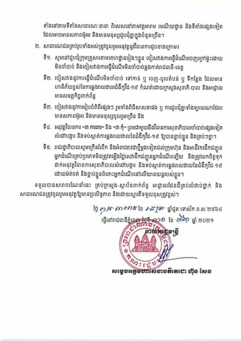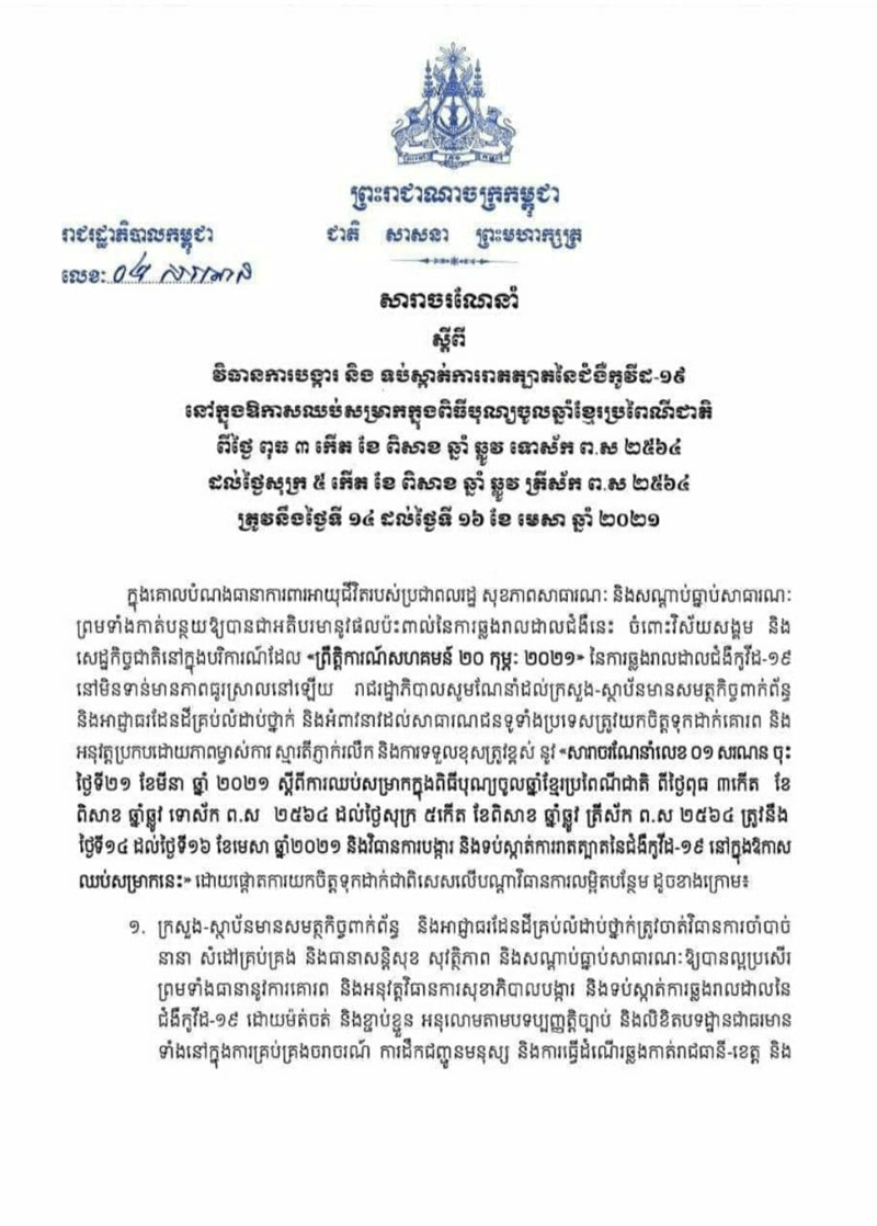 ភ្នំពេញៈ នៅ ថ្ងៃ ទី ៣១ ខែ មីនា ឆ្នាំ ២០២១ រាជរដ្ឋាភិបាល កម្ពុជា បាន ចេញ សារាចរ ណែនាំ ស្ដី ពី វិធានការ បង្ការ និង ទប់ស្កាត់ ការ រាតត្បាត នៃ វីរុស កូវីដ-១៩ នៅ ក្នុង ឱកាស ឈប់ សម្រាក បុណ្យ ចូលឆ្នាំ ប្រពៃណី ជាតិ ដែល នឹង ប្រារព្ធ ធ្វើ ឡើង ចាប់ ពី ថ្ងៃ ទី ១៤ រហូត ដល់ ថ្ងៃ ទី ១៦ ខែ មេសា ឆ្នាំ ២០២១ ខាង មុខ នេះ ។ ក្នុង សារាចរ នោះ ដែរ រាជរដ្ឋាភិបាល បាន ធ្វើ ការ ស្នើ ឱ្យ ក្រសួង-ស្ថាប័ន មាន សមត្ថកិច្ច ពាក់ព័ន្ធ និង អាជ្ញាធរ ដែនដី គ្រប់ លំដាប់ ថ្នាក់ ត្រូវ ចាត់ វិធានការ ចាំបាច់ នានា សំដៅ គ្រប់គ្រង និង ធានា សន្ដិសុខ សុវត្ថិភាព និង សណ្ដាប់ធ្នាប់ សាធារណៈ ឱ្យ បាន ល្អ ប្រសើរ ព្រម ទាំង ធានា ឱ្យបាន ម៉ត់ចត់ ក្នុង ការ គ្រប់គ្រង ចរាចរណ៍ ការ ដឹក ជញ្ជូន មនុស្ស និង ការ ធ្វើ ដំណើរ កាត់ រាជធានី-ខេត្ត។ ព្រម គ្នា នោះ ដែរ រាជរដ្ឋាភិបាល ក៏ បាន ប្រកាស ប្រា