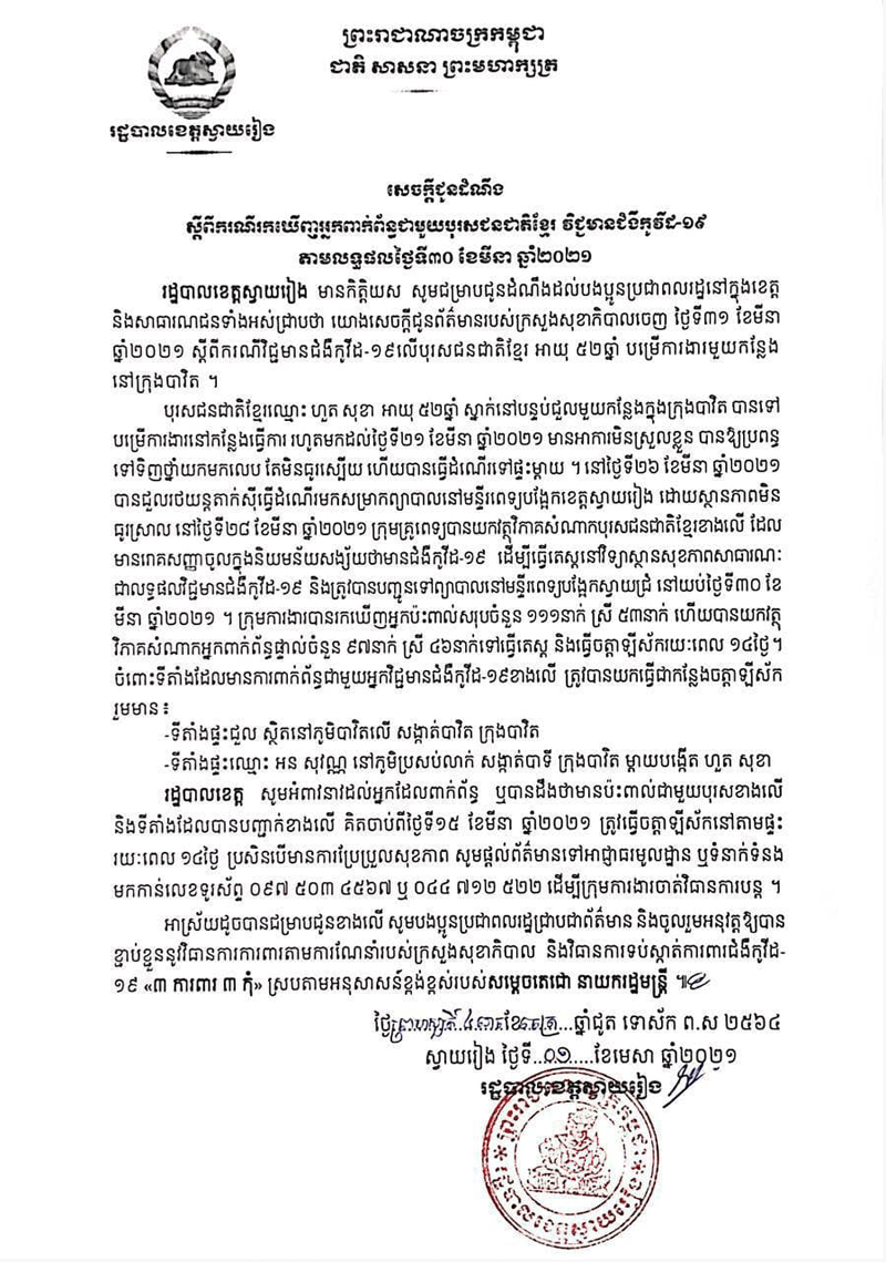 រដ្ឋបាលខេត្តស្វាយរៀង សូមអំពាវនាវដល់អ្នកដែលពាក់ព័ន្ធ ឬបានដឹងថាមានប៉ះពាល់ជាមួយ បុរសខាងលើ និងទីតាំងដែលបានបញ្ជាក់ខាងលើ គិតចាប់ពីថ្ងៃទី១៥ មីនា ត្រូវធ្វើចត្តាឡីស័ក នៅតាមផ្ទះ រយៈពេល ១៤ថ្ងៃ ប្រសិនបើមានការប្រែប្រួលសុខភាព សូមផ្តល់ព័ត៌មានទៅ អាជ្ញាធរមូលដ្ឋាន ៕