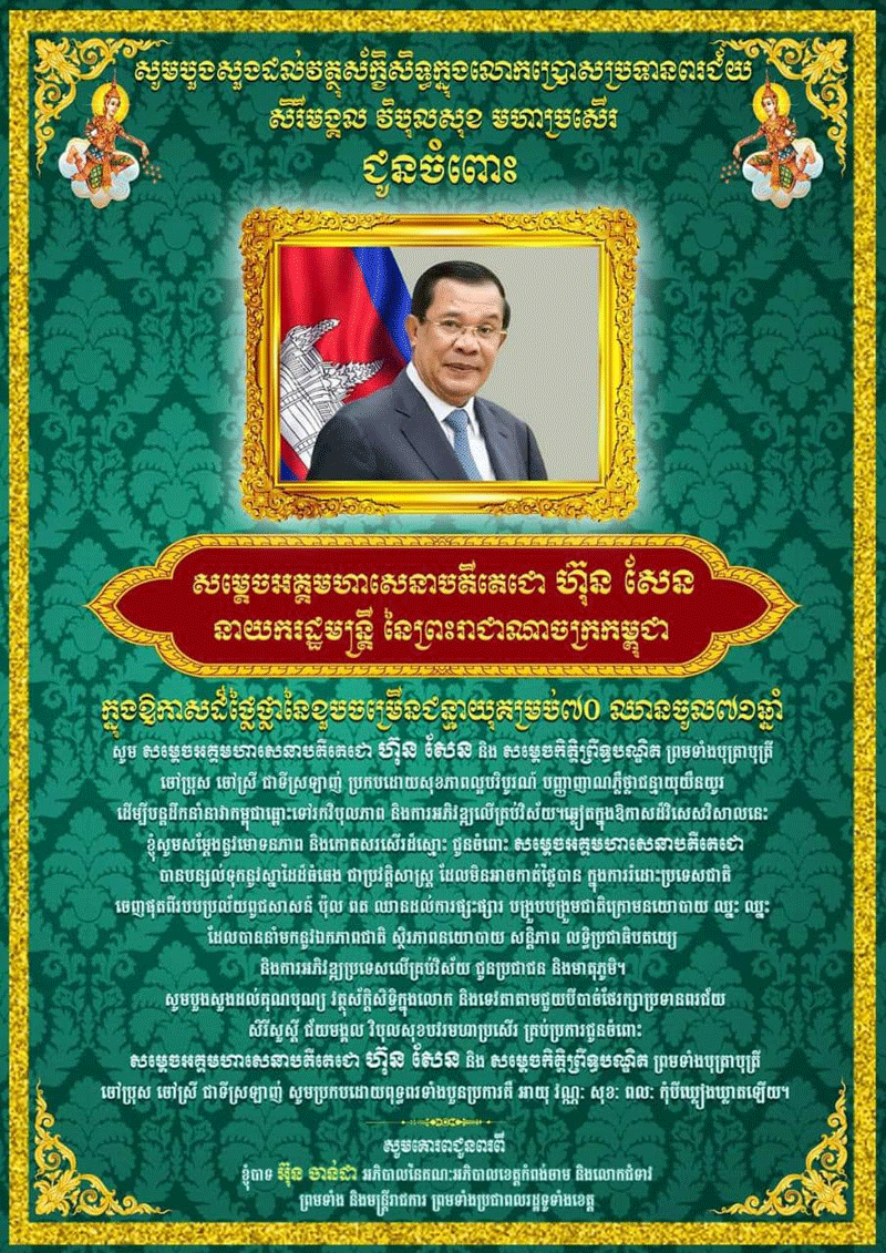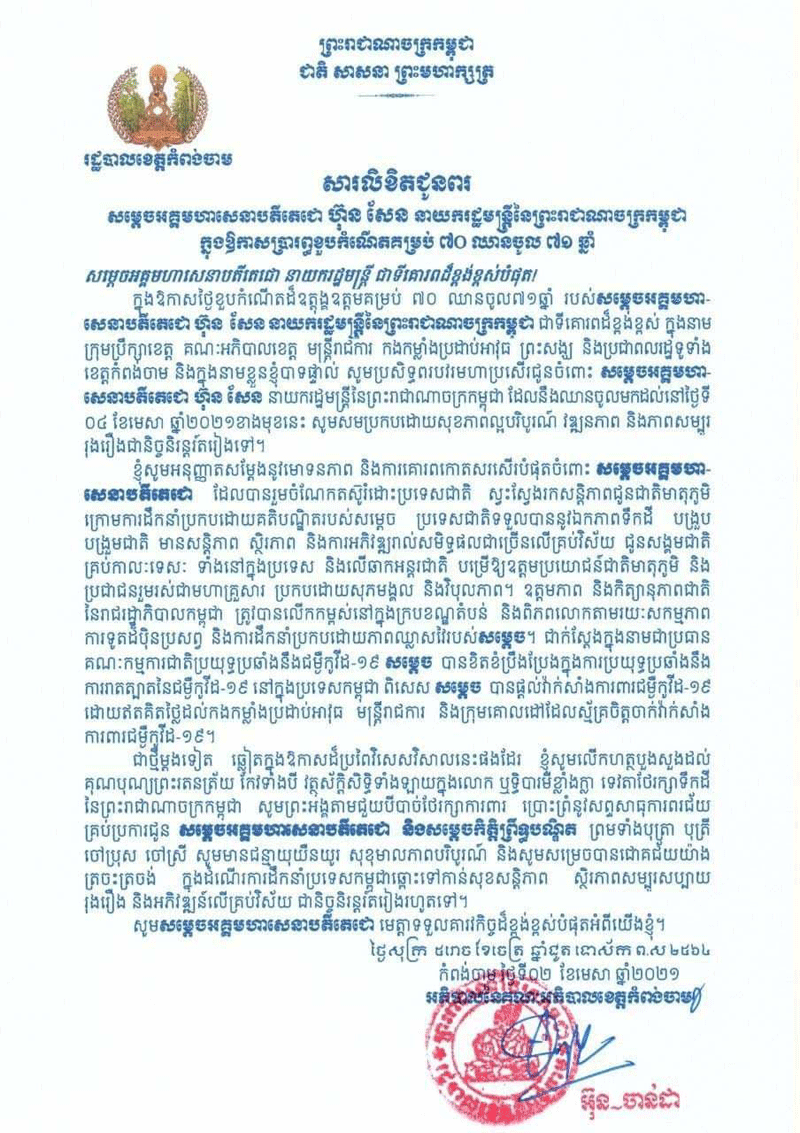 ឯកឧត្តម អ៊ុន ចាន់ដា អភិបាលនៃគណៈអភិបាលខេត្តកំពង់ចាម ផ្ញើសារលិខិតជូនពរ គោរពជូន សម្តេចអគ្គមហាសេនាបតីតេជោ ហ៊ុន សែន នាយករដ្ឋមន្ត្រីនៃព្រះរាជាណាចក្រកម្ពុជា ក្នុងឱកាសប្រារព្ធខួបកំណើតគម្រប់ ៧០ឆ្នាំ ឈានចូល ៧១ឆ្នាំ