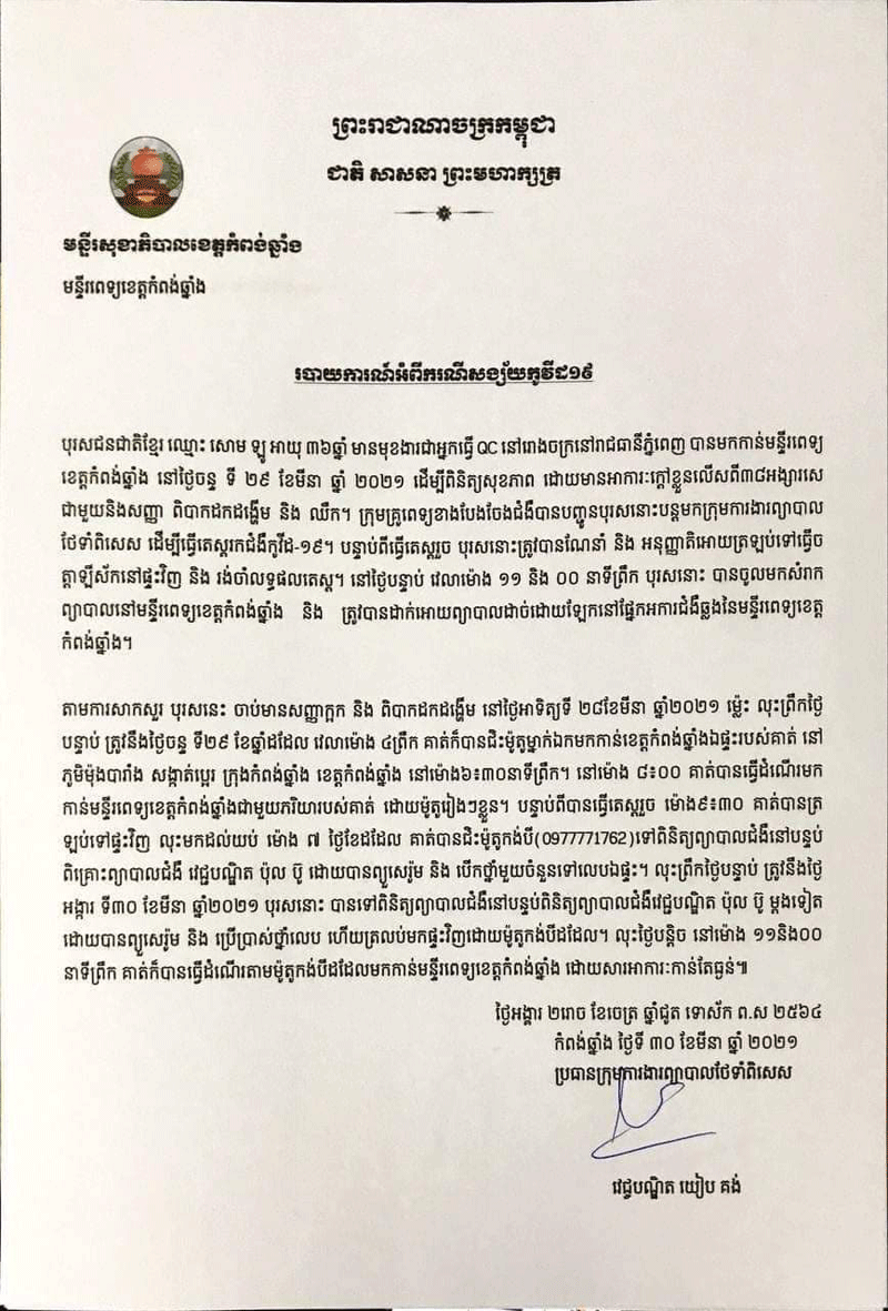 បើយោងតាម របាយការណ៍របស់លោកមន្ទីរសុខាភិបាលខេត្តកំពង់ ឆ្នាំងបានបញ្ជាក់អោយដឹងថា អ្នកជំងឺរូបនេះមុននឹងរកឃើញវិជ្ជ មានកូវីដ១៩ បានចូលទៅព្យាបាលនៅផ្ទះពេទ្យឯកជន មួយកន្លែង លោក វេជ្ជប ណ្ឌិត ប៉ុល ប៊ូ ចំនួន២ដង ដោយជិះម៉ូតូកង់បីមួយគ្រឿងជាច្រើនដង លេខម្ចាស់កង់បី ០៩៧ ៧៧៧ ១៧ ៦២ នៅក្នុងក្រុងកំពង់ឆ្នាំង ។