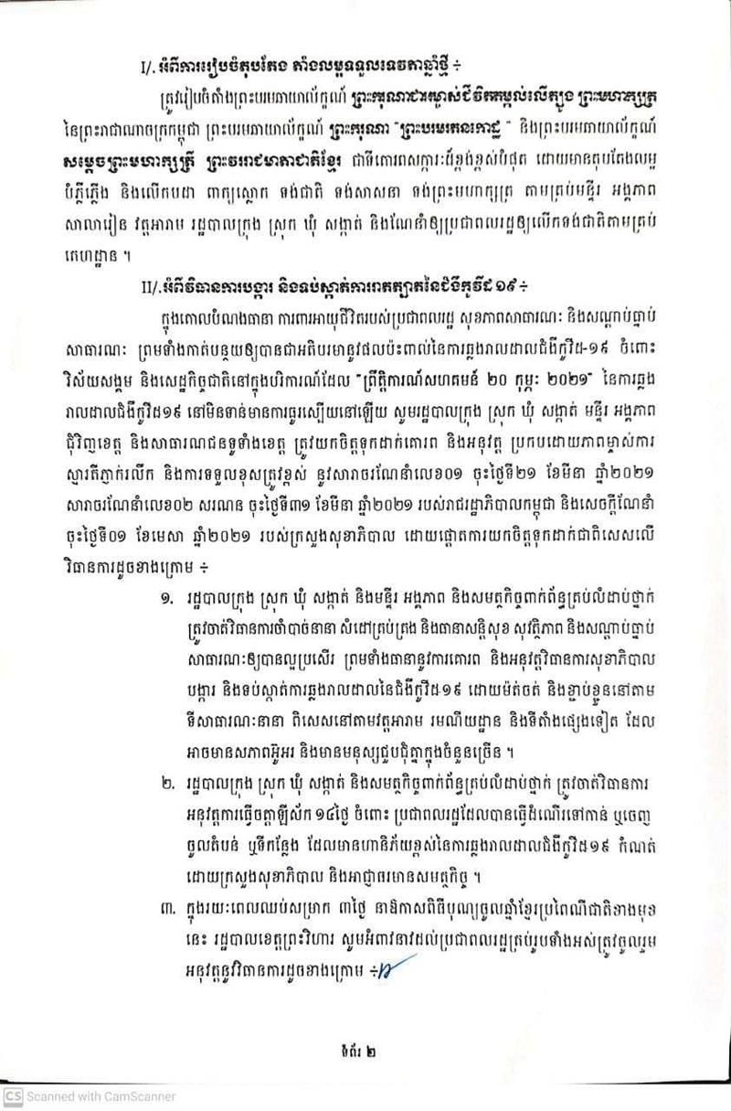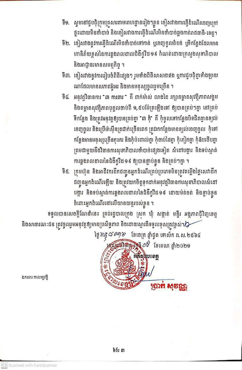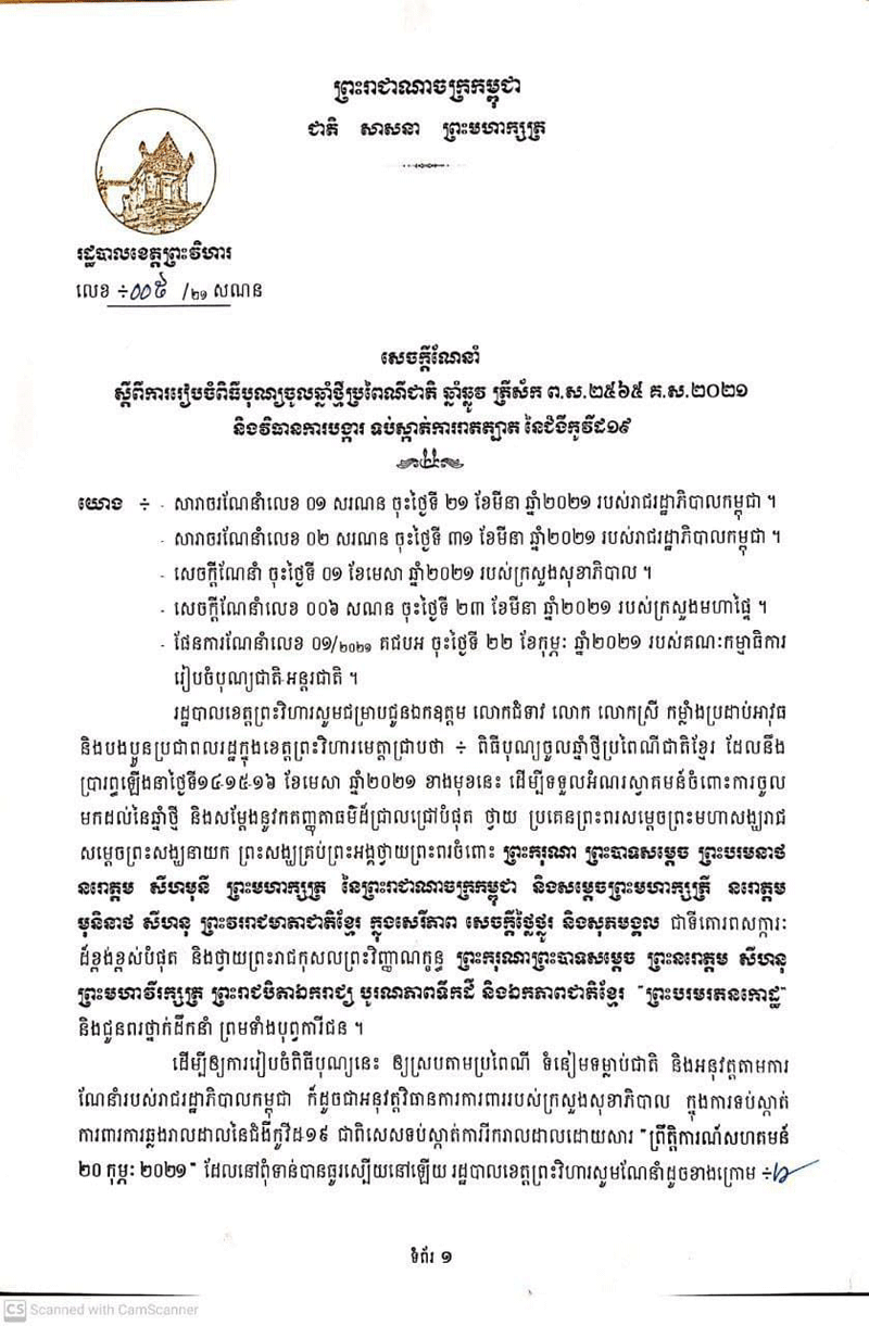 រដ្ឋបាល ខេត្តព្រះវិហារ បានចេញសេចក្តី ណែនាំ ស្តីពីការ រៀបចំ ពិធី បុណ្យ ចូល ឆ្នាំថ្មី ប្រពៃណី ជាតិខ្មែរ ឆ្នាំឆ្លូវ គ្រឹស័ក ព.ស.២៥៦៥ គ.ស.២០២១ មានការប្រុងប្រយ័ត្ននិងវិធានការបង្ការ ទប់ស្កាត់ ការរាតត្បាត នៃជំងឺកូវីដ-១៩៕ admin — 05/04/2021 in ព័ត៌មានជាតិ 40 Likes 197 Views Share Tweet on Twitter Share on Facebook Google+ Pinterest