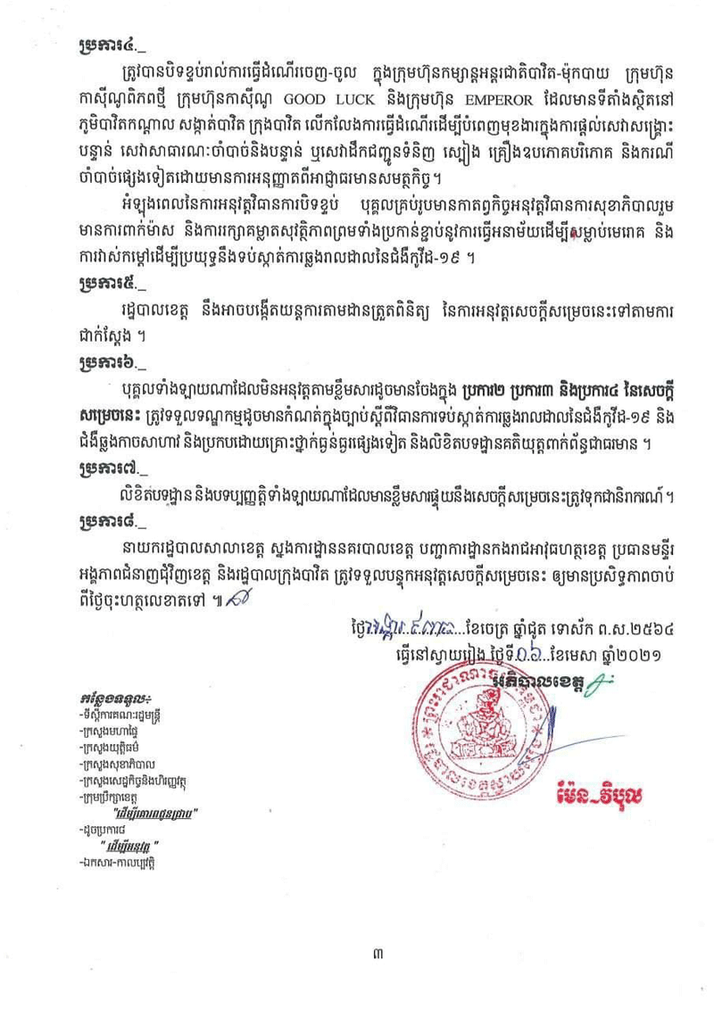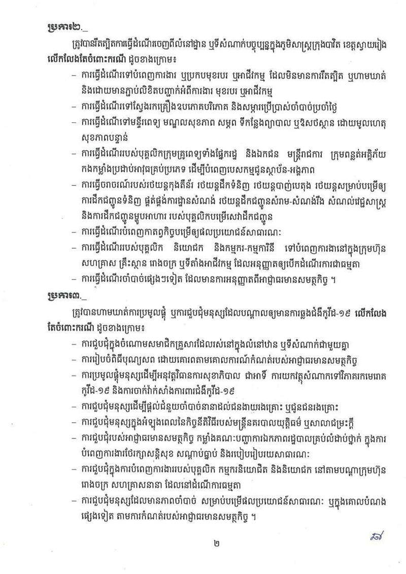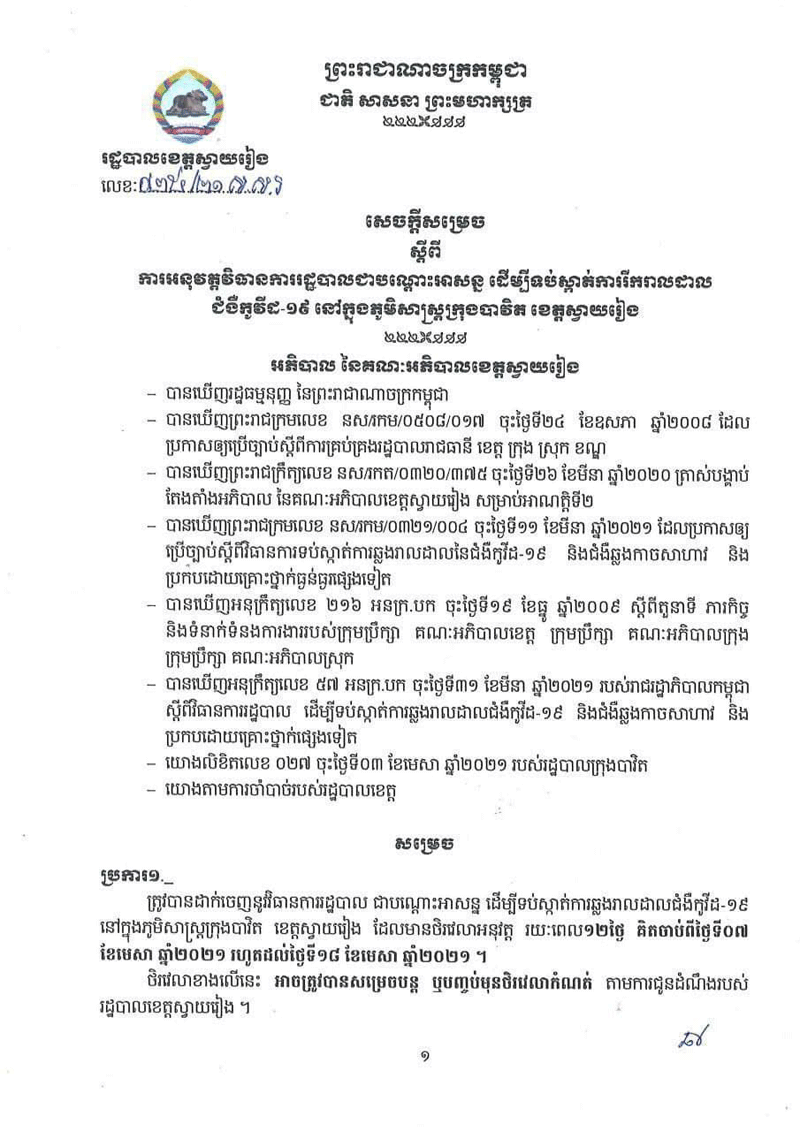 ខេត្តស្វាយរៀង៖យោងតាមរដ្ឋបាលខេត្ត ស្វាយរៀង បាន ចេញសេចក្តី សម្រេច ការអនុវត្ត វិធានការ រដ្ឋបាល ជាបណ្តោះអាសន្ន ដើម្បីទប់ស្កាត់ ការ រីករាលដាល ជំងឺកូវីដ ១៩ ក្នុង ភូមិសាស្រ្ត ក្រុង បាវិត ខេត្ត ស្វាយរៀង។បើយោង តាម សេចក្តី សម្រេច នោះ អាជ្ញាធរចេញវិធានការរឹតត្បិតការចេញពីផ្ទះ និងការជួបជុំនៅក្នុងក្រុងបាវិត ខេត្តស្វាយរៀងរយៈពេល ១២ ថ្ងៃ ចាប់ពីថ្ងៃ ០៧ ខែមេសា ឆ្នាំ ២០២១ ដល់ ថ្ងៃ ១៨ ខែមេសា ឆ្នាំ ២០២១។ សូម អាន ព័ត៌មាន លម្អិតសេចក្ដីសម្រេច ខាងក្រោម៖