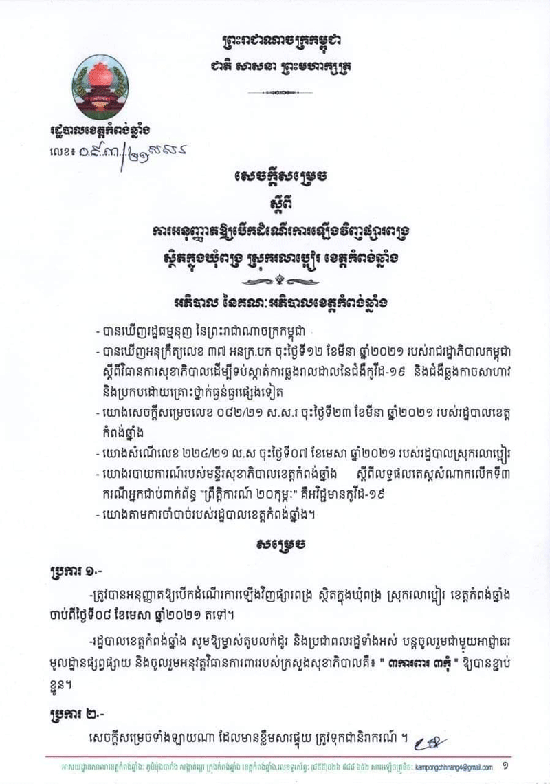 កំពង់ឆ្នាំង៖រដ្ឋបាលខេត្តកំពង់ឆ្នាំងបាន សម្រេចការអនុញ្ញាតឱ្យបើកដំណើរការឡើងវិញ ហើយនៅផ្សារពង្រ ស្ថិតនៅក្នុងឃុំពង្រស្រុករលាប្អៀរ ខេត្តកំពង់ឆ្នាំងនៅថ្ងៃទី៧មេសា២០២១។