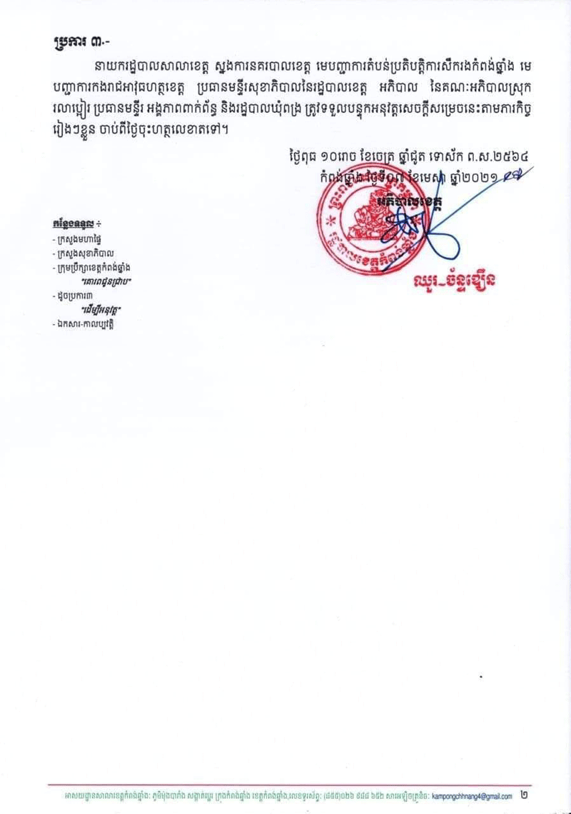 ក្នុងនោះរដ្ឋបាលខេត្ត ក៏បានអំពាវនាវដល់ប្រជាពលរដ្ឋត្រូវតែចូលរួមអនុវត្តតាមអនុសាសន៍ដ៏មានតម្លៃ របស់សម្តេចតេជោ គឺ៣ការពារ ៣កុំ និង២ ចូលរួម និងគោលការណែនាំរបស់ក្រសួងសុខាភិបាល ឱ្យបានត្រឹមត្រូវ ៕អ្នកស្រីសានផល្លា