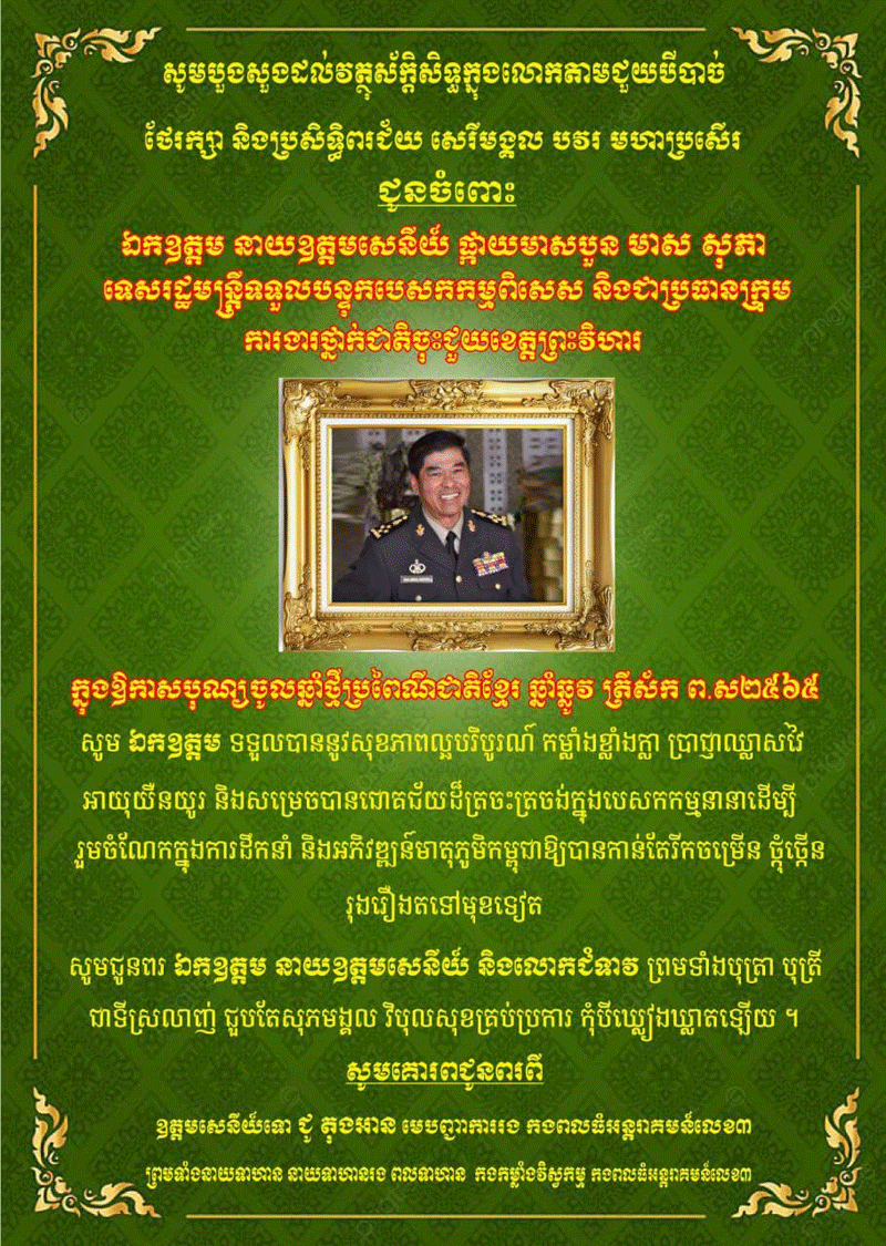 ឯកឧត្តម ឧត្តមសេនីយ៍ទោ ជូ តុងអាន មេបញ្ជាការរងកងពលធំអន្តរាគមន៍លេខ៣ផ្ញើរលិខិតជូន ឯកឧត្តមនាយឧត្តមសេនីយ៍ ផ្កាយមាសបួន មាស សុភា ទេសរដ្ឋមន្ត្រីទទួលបន្ទុកបេសកកម្មពិសេសនិងជា ប្រធានក្រុមការងារថ្នាក់ជាតិចុះជួយខេត្តព្រះវិហារ ក្នុងឱកាសបុណ្យចូលឆ្នាំថ្មី ប្រពៃណីជាតិ admin — 14/04/2021 in ព័ត៌មានជាតិ 38 Likes 263 Views Share Tweet on Twitter Share on Facebook Google+ Pinterest