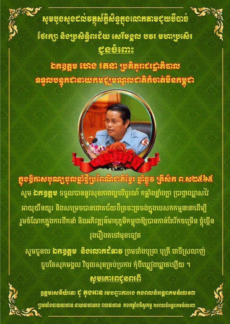 ឯកឧត្តម ឧត្តមសេនីយ៍ទោ ជូ តុងអាន មេបញ្ជាការរងកងពលធំអន្តរាគមន៍លេខ៣ផ្ញើរលិខិតជូន ឯកឧត្តម ហេង រតនា ប្រតិភូរាជរដ្ឋាភិបាលទទួលបន្ទុកជានាយកមជ្ឈមណ្ឌលជាតិ កំចាត់មីនកម្ពុជា ក្នុងឱកាសបុណ្យចូលឆ្នាំថ្មី ប្រពៃណីជាតិ admin — 15/04/2021 in ព័ត៌មានជាតិ 43 Likes 373 Views Share Tweet on Twitter Share on Facebook Google+ Pinterest