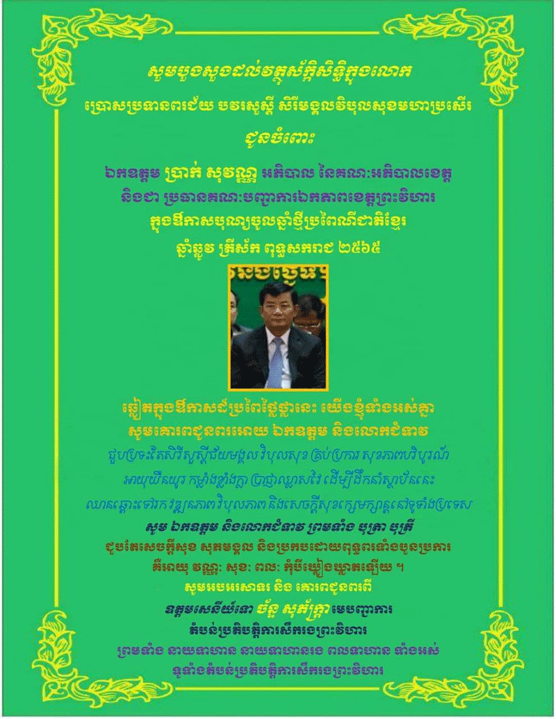 ឯកឧត្តម ឧត្តមសេនីយ៍ទោ ច័ន្ទ សុភ័ក្ត្រា មេបញ្ជាការតំបន់ប្រតិបត្តការសឹករងខេត្តព្រះវិហារ ផ្ញើរលិខិតជូន ឯកឧត្តម ប្រាក់ សុវណ្ណអភិបាលនៃគណៈអភិបាលខេត្តនិងជាប្រធានគណៈបញ្ជាការ ឯកភាពខេត្តព្រះវិហារ ក្នុងឱកាស បុណ្យចូលឆ្នាំថ្មី ប្រពៃណីជាតិ admin — 15/04/2021 in ព័ត៌មានជាតិ 45 Likes 205 Views Share Tweet on Twitter Share on Facebook Google+ Pinterest