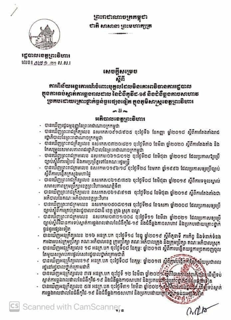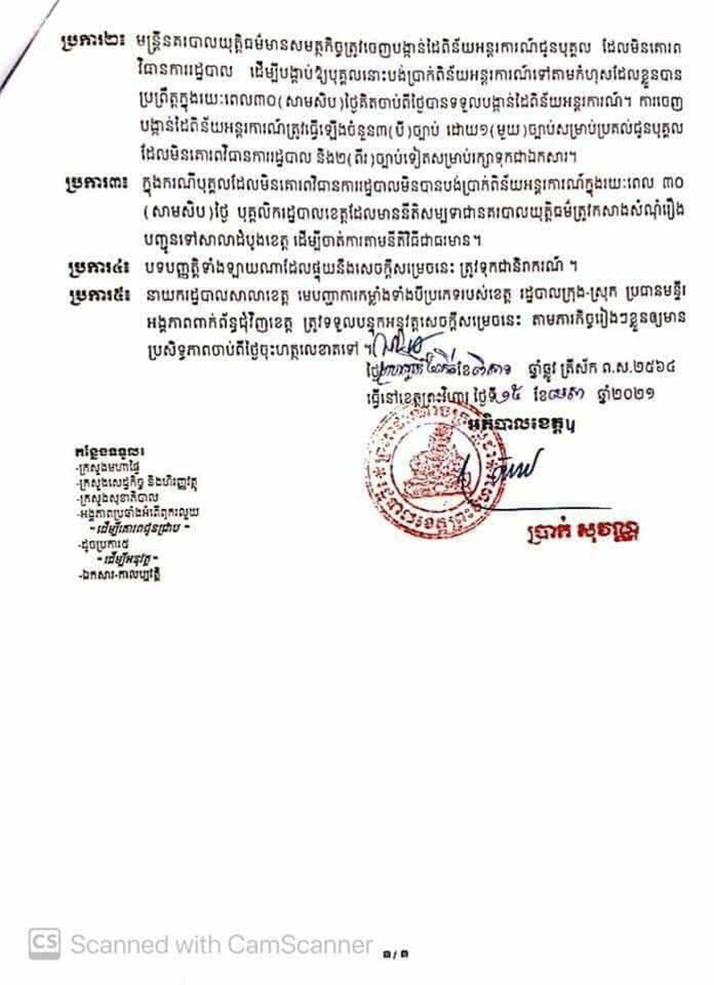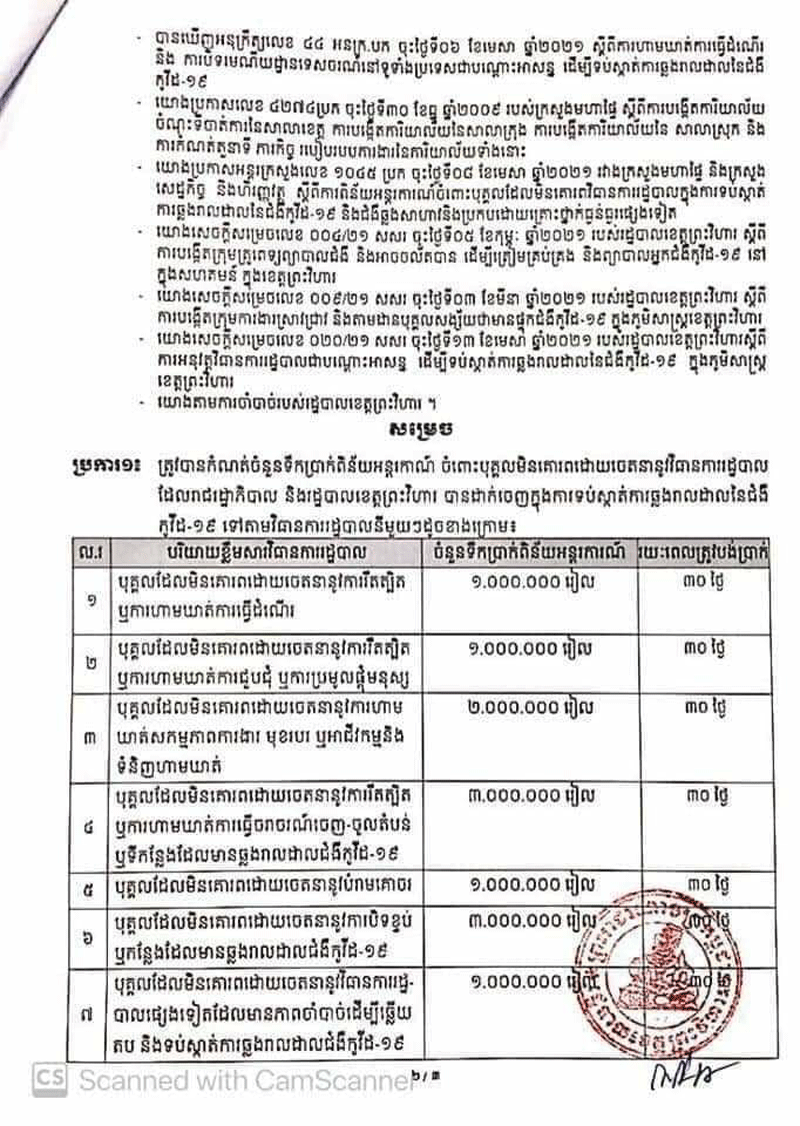 រដ្ឋបាល ខេត្តព្រះវិហារ ឯកឧត្តម ប្រាក់ សុវណ្ណ អភិបាលខេត្ត ព្រះវិហារ ចេញ សេចក្តីសម្រេច លេខ០២១/២១ ស.ស.រ ចុះថ្ងៃទី ១៥ ខែ មេសា ឆ្នាំ ២០២១ ស្តីពីការ ពិន័យ អន្តរការណ៍ ចំពោះ បុគ្គល ដែល មិន គោរព វិធានការ រដ្ឋបាល ក្នុងការ ទប់ស្កាត់ ការ ឆ្លង រាលដាល នៃ ជំ ងី កូវីដ-១៩ និង ជំងឺឆ្លង កាចសាហាវប្រកបដោយគ្រោះថ្នាក់ធ្ងន់ធ្ងរផ្សេងទៀត ក្នុងភូមិសាស្ត្រខេត្តព្រះវិហារ។ សូមគោរព ជូនជ្រាបជាព័ត៌មាន ជូន ដល់បងប្អូនប្រជាពលរដ្ឋនៅទូទាំងខេត្តព្រះវិហារ និងអ្នកពាក់ព័ន្ធ អាជ្ញាធរ មាន សមត្ថកិច្ច ត្រូវ អនុវត្ត នូវ សេចក្តី សម្រេចរបស់រដ្ឋបាលខេត្ត អោយមានប្រសិទ្ធភាពចាប់ពីថ្ងៃចុះហត្ថលេខានេះតទៅ។SPS