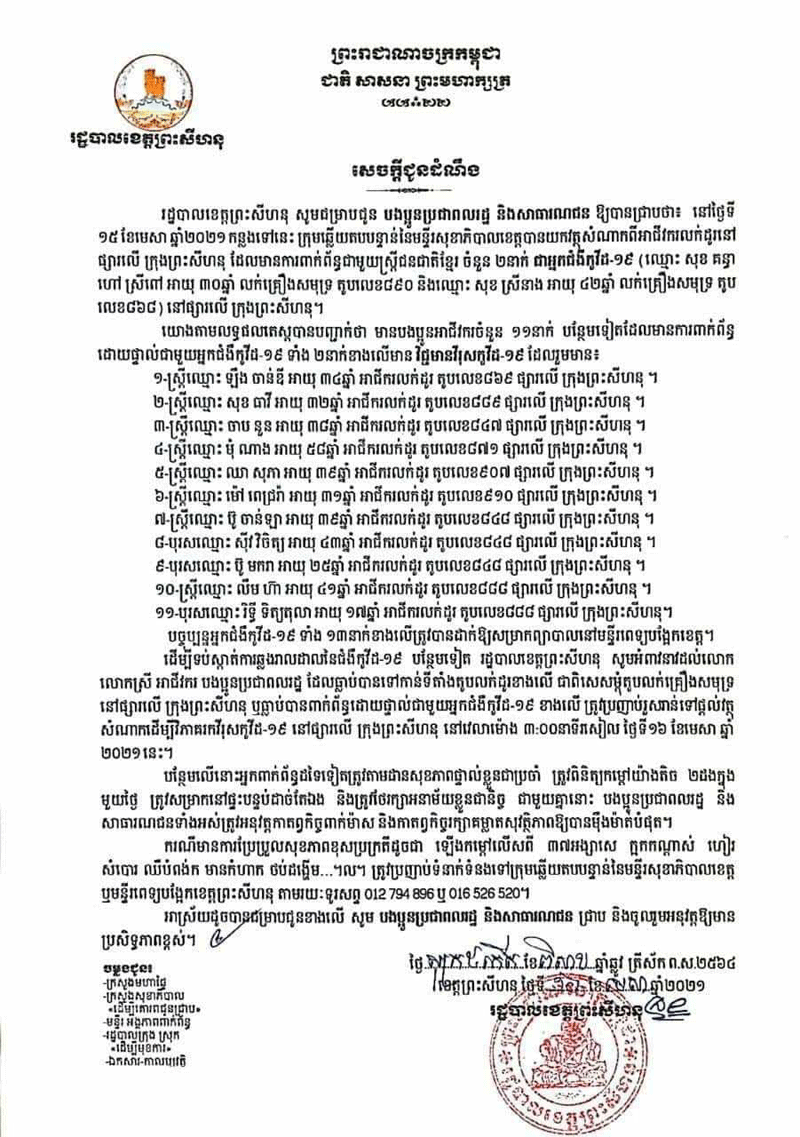 ដើម្បីទប់ស្កាត់ការចម្លងបន្ថែម អជ្ញាធររដ្ឋបាលខេត្តព្រះសីហនុ បានតម្រូវឲ្យបងប្អូនអាជីវករទាំង អស់ក្នុងផ្សារលើ ព្រមទាំងពលរដ្ឋ អតិថិជនដែលធ្លាប់ប៉ះពាល់ផ្ទាល់ជាមួយ អ្នកលក់ដូរដែល មានវិជ្ជមានកូវីដ១៩នេះ មកយកសំណាកតេស្តជាចាំបាច់។