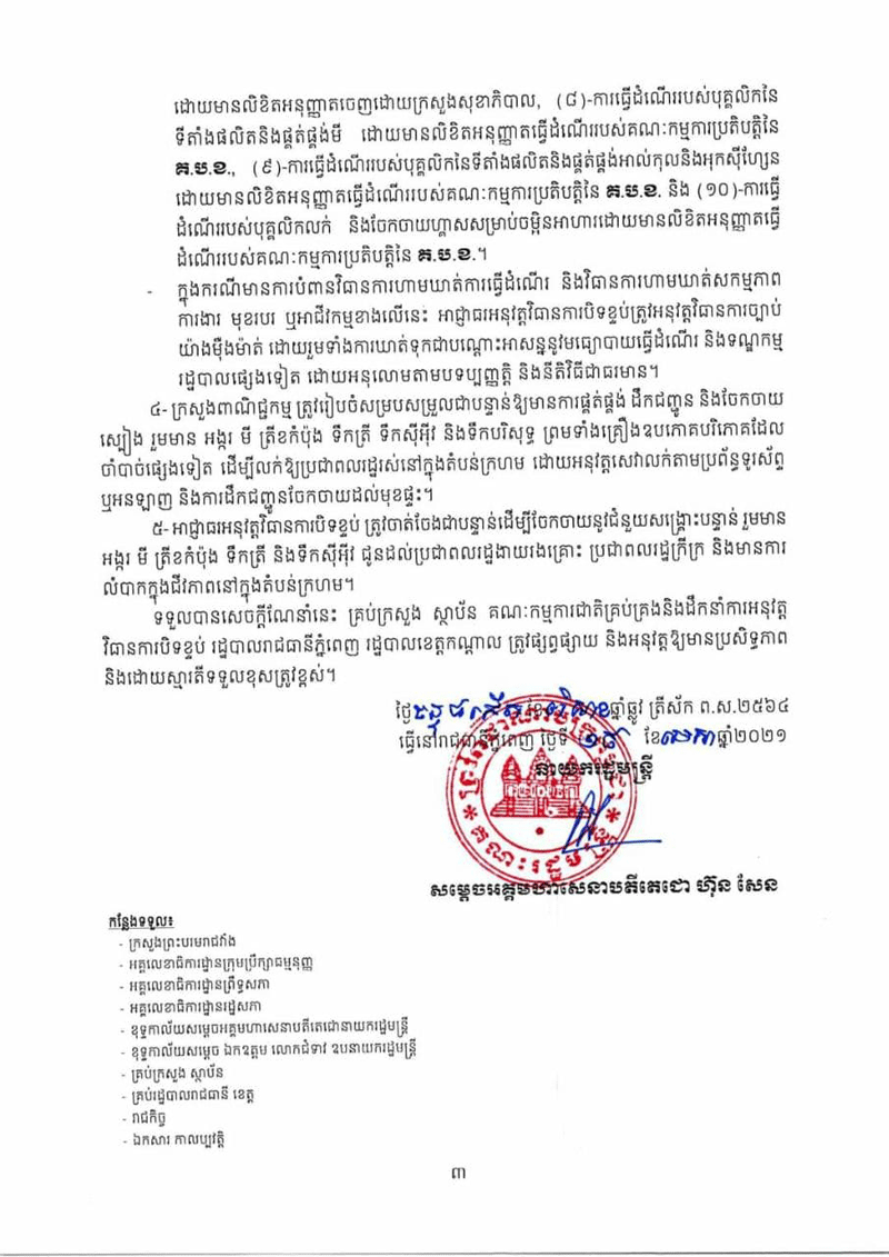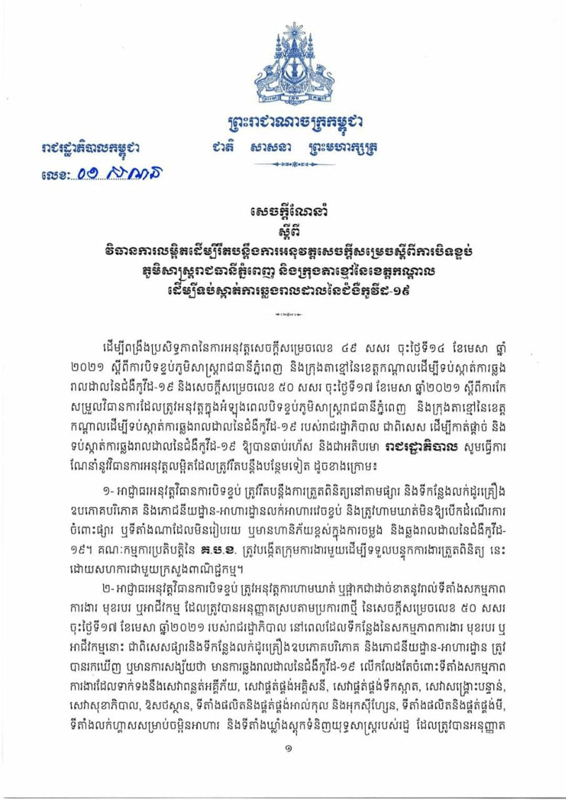 នៅរសៀលថ្ងៃទី១៩ ខែមេសា ឆ្នាំ២០២១នេះ ប្រមុខរាជរដ្ឋាភិបាល សម្តេចតេជោ ហ៊ុន សែន បានចេញសេចក្តីណែនាំបន្ទាន់មួយ លើវិធានការលម្អិតដើម្បីរឹតបណ្តឹងការអនុវត្តក្នុងអំឡុង ពេល បិទខ្ទប់ (LOCKDOWN) រាជធានីភ្នំពេញ និងក្រុងតាខ្មៅ