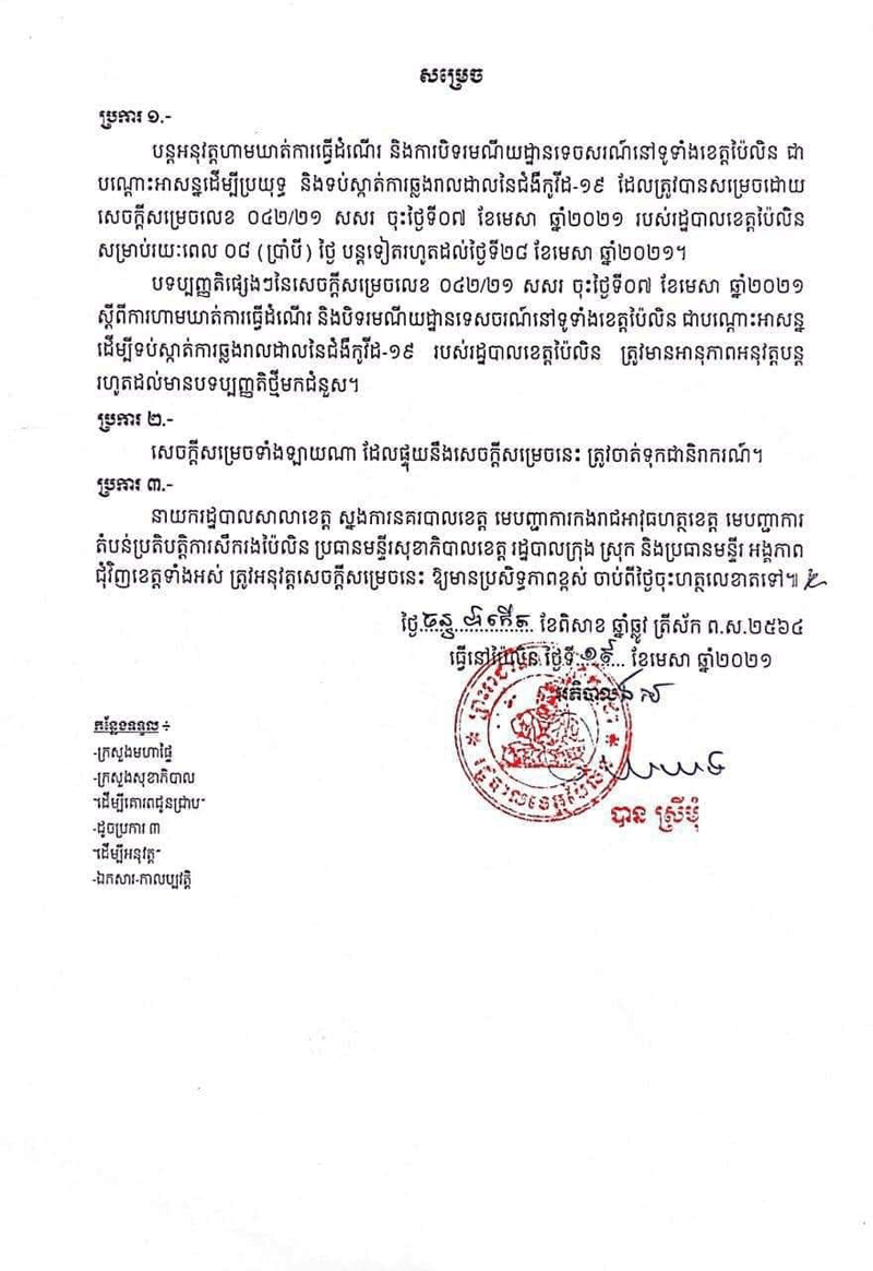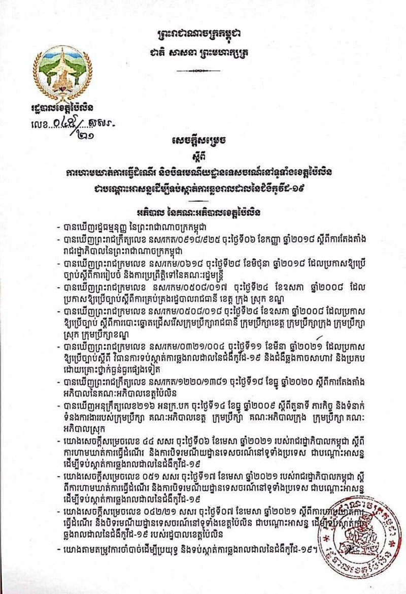 សូមបញ្ជាក់ផងដែរថា ៖ ដើម្បីចូលរួមទប់ស្កាត់ការឆ្លងរីករាលដាល នៃជំងឺកូវីដ-១៩ រដ្ឋបាលខេត្តប៉ៃលិន បានចេញសេចក្តីសម្រេច ដោយហាមឃាត់ ប្រជាពលរដ្ឋ ក្នុងការធ្វើដំណើរឆ្លងកាត់ ចេញ-ចូល ពីខេត្តផ្សេងចូលមកខេត្តប៉ៃលិន ឬចេញពីប៉ៃលិនឆ្ពោះទៅបណ្តាខេត្តនានា ជាបណ្តោះអាសន្ន សម្រាប់រយៈពេល១៤ថ្ងៃ ដោយគិតចាប់ពីម៉ោង០ (សូន្យ) កាលពីថ្ងៃទី០៧ ខែមេសា ឆ្នាំ២០២១ រហូតដល់ថ្ងៃទី២០ ខែមេសា ឆ្នាំ២០២១ ទើបបើកឱ្យដំណើរការឡើងវិញ ក្នុងគោលបំ ណងប្រយុទ្ធ និងទប់ស្កាត់ការឆ្លងរាលដាល នៃជំងឺកូដ-១៩ ។ តែរហូតមកដល់ពេលនេះ ដោយសារសភាព នៃការឆ្លងជំងឺកូវីដ-១៩ នៅតែមិនព្រមថមថយចុះវិញ ទើបរដ្ឋបាលខេត្តប៉ៃលិន បានសម្រេ ចនឹងបន្តបិទការធ្វើដំណើរចេញចូលក្នុងខេត្ត រយ:ពេល០៨ថ្ងៃទៀត ។