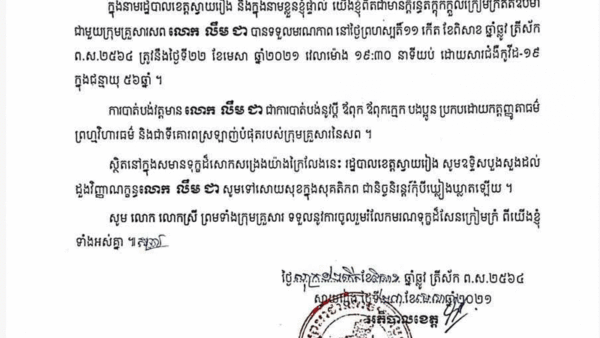 លិខិតរំលែកទុក្ខអាជ្ញាធរខេត្តជូនដល់ក្រុមគ្រួសារសពស្លាប់ដោយសារជម្អឺកូវិដ១៩