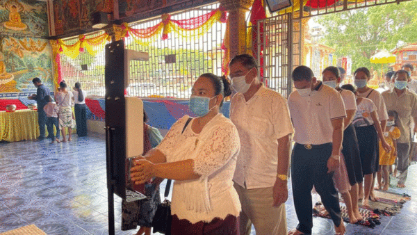 សកម្មភាពឧបាសកឧបាសិកានាំគ្នាប្រគេនចង្ហាន់ព្រះសង្ឃនៅថ្ងៃចូលឆ្នាំថ្មីប្រពៃណីជាតិក្នុងថ្ងៃដំបូង មានសភាពស្ងប់ស្ងាត់ ដោយមានការពាក់ម៉ាសការពារបញ្ហាជំងឺកូវីដ១៩